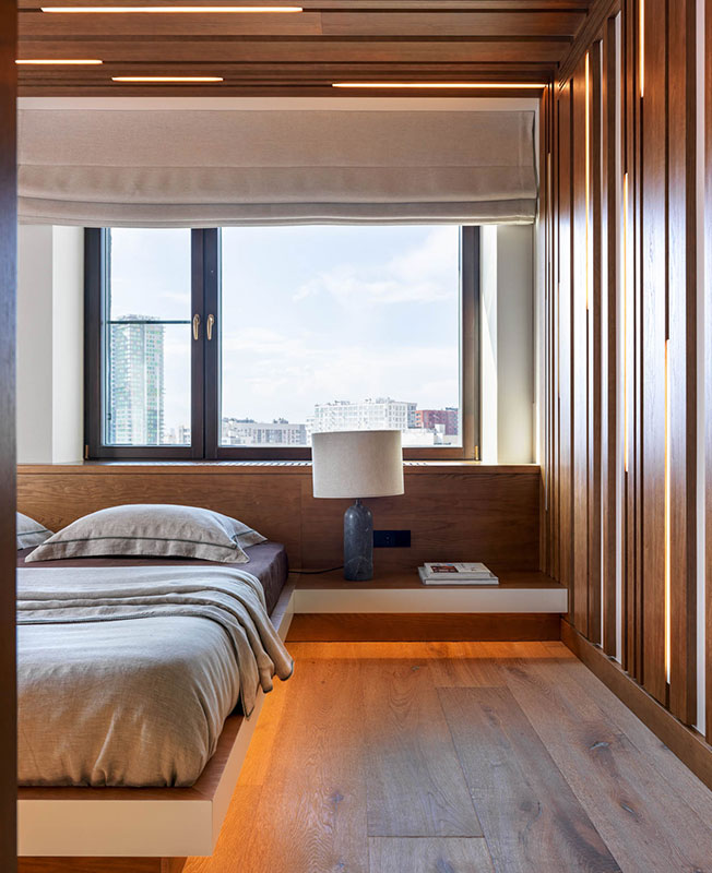 Спальня и кабинет. Матрас Dreamline. Постельное белье Marki Home Moscow. Настольная лампа Gubi. Картина Булата Баишева из галереи Art Brut Moscow. Столярные конструкции сделаны в столярной мастерской по эскизам Art Group.