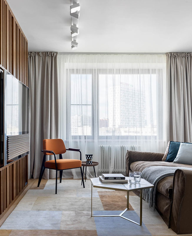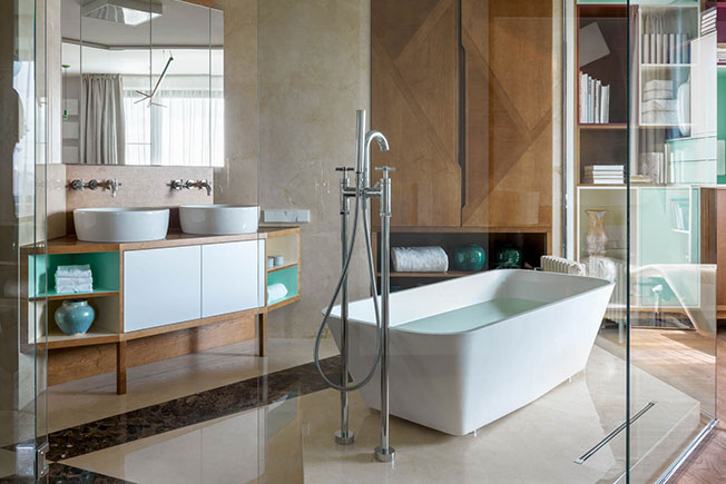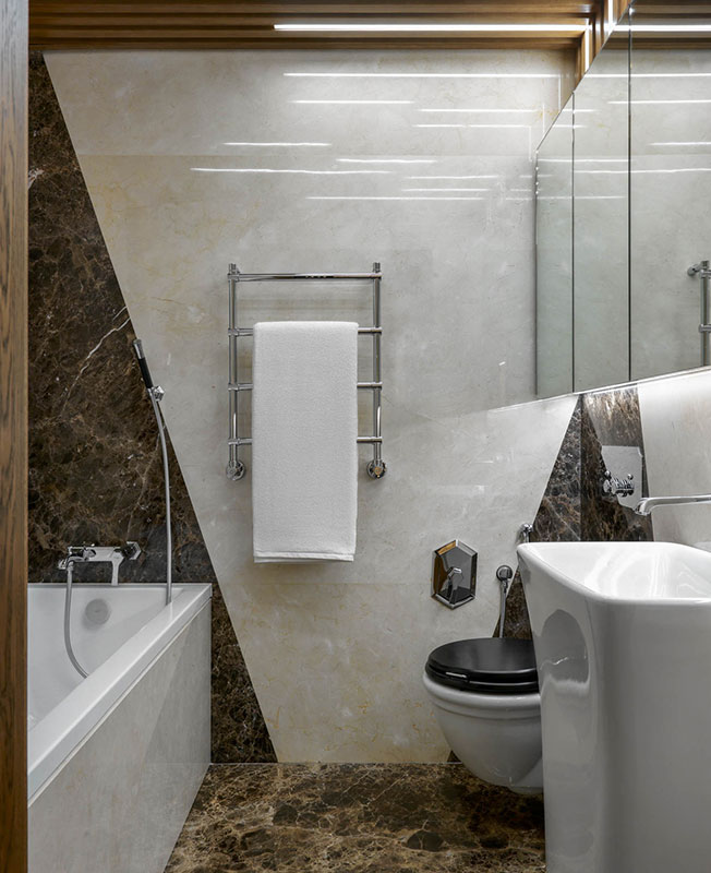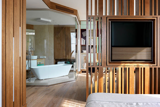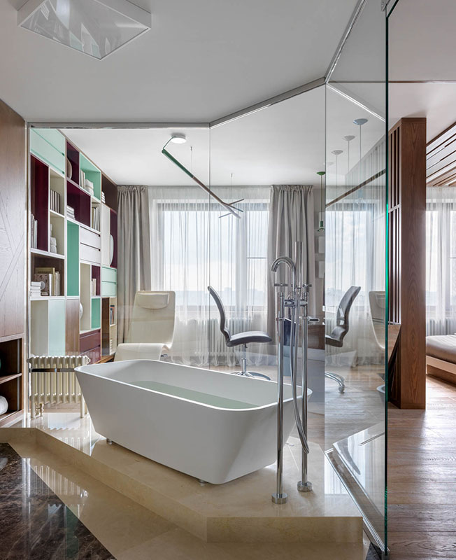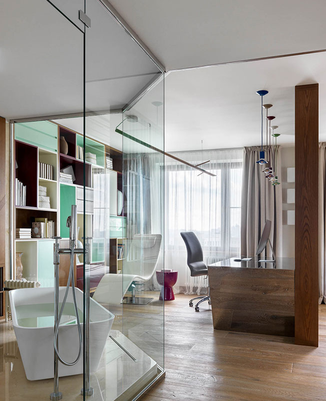 «Заказчик просил хороший диван и телевизор (это было единственным его требованием), так появился диван Baxter. В квартире есть комната для йоги, хозяйка увлекается духовными практиками». Расслабиться можно и в ванне — лежа в воде и смотря телевизор через стеклянную стену. Такое необычное решение стирает границы между санузлом и жилыми комнатами, визуально увеличивая пространство. Зона душевой и туалета при этом скрыты.