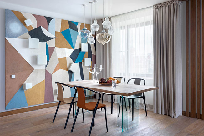 Зона столовой. Стол Cattelan Italia. Стулья Belleville, Vitra. Свет Cangini & Tucci. Картина на стене — работа художницы Анастасии Малиновской. Столярные конструкции сделаны в столярной мастерской по эскизам Art Group.