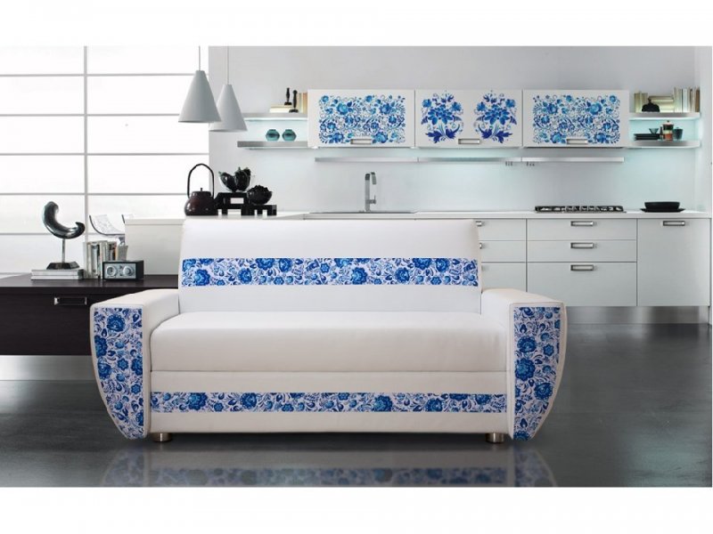 Дело в том, что синий, голубой и белый — это основа цветовой композиции скандинавских интерьеров. Цветы в них встречаются не так часто, да и культура далека от нашей. Однако из-за сходства между гжельской росписью и морозными узорами на стенах, «холодный» стиль на удивление «тепло» принимает классическое русское искусство. Акриловыми панелями отделывают кухонные фартуки, зоны над изголовьями кроватей в спальнях, мобильные перегородки или отдельные области в совмещенных комнатах. Глянцевый блеск поверхности придает орнаменту строгость и солидность, словно глазурь на фарфоровой вазе.