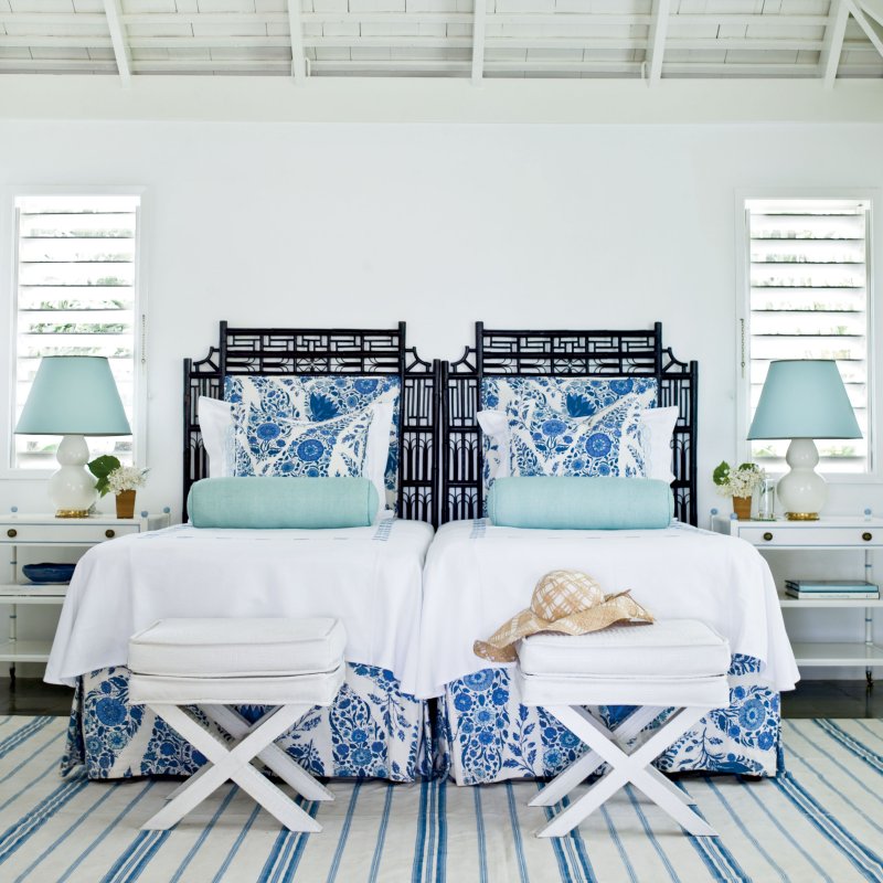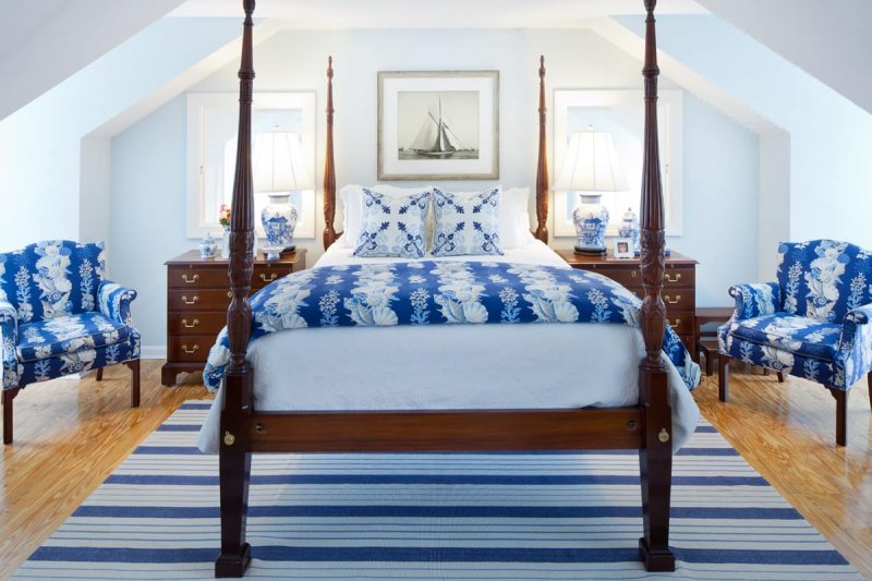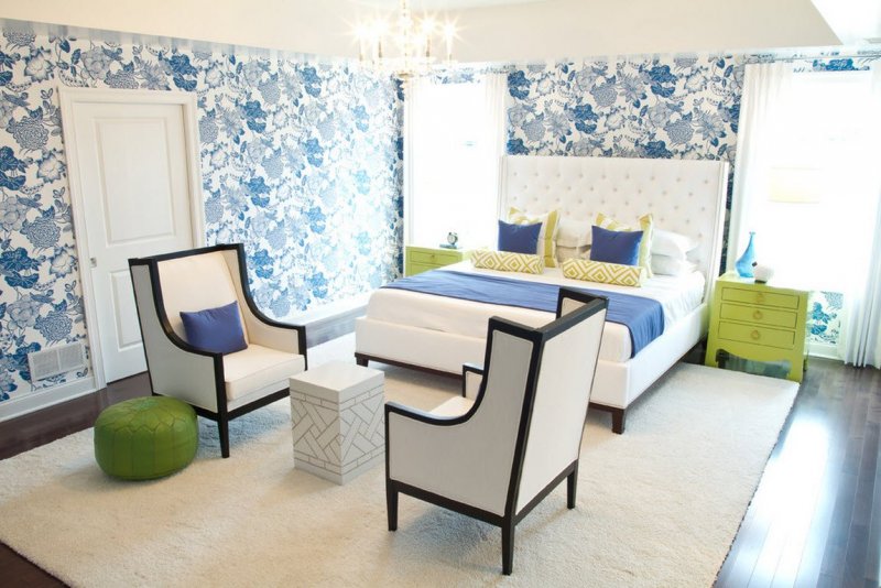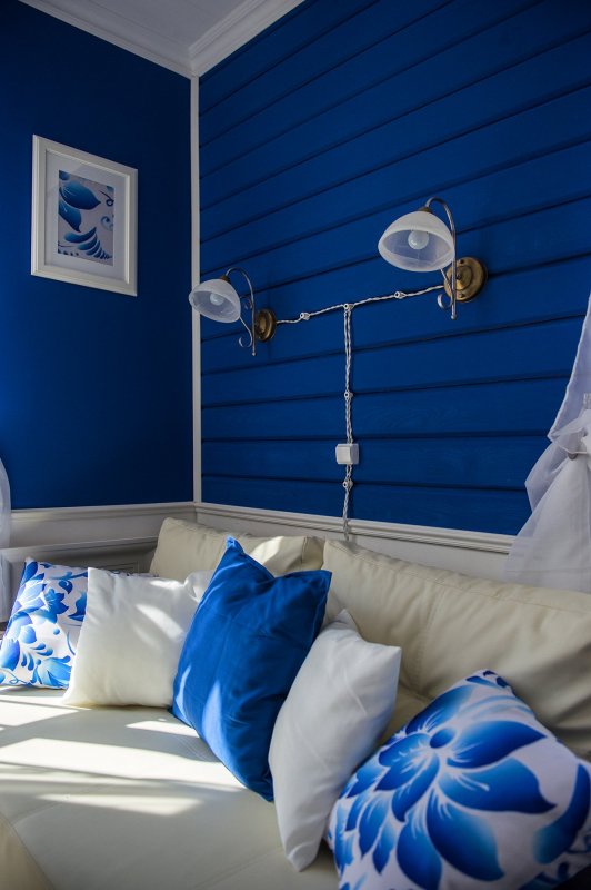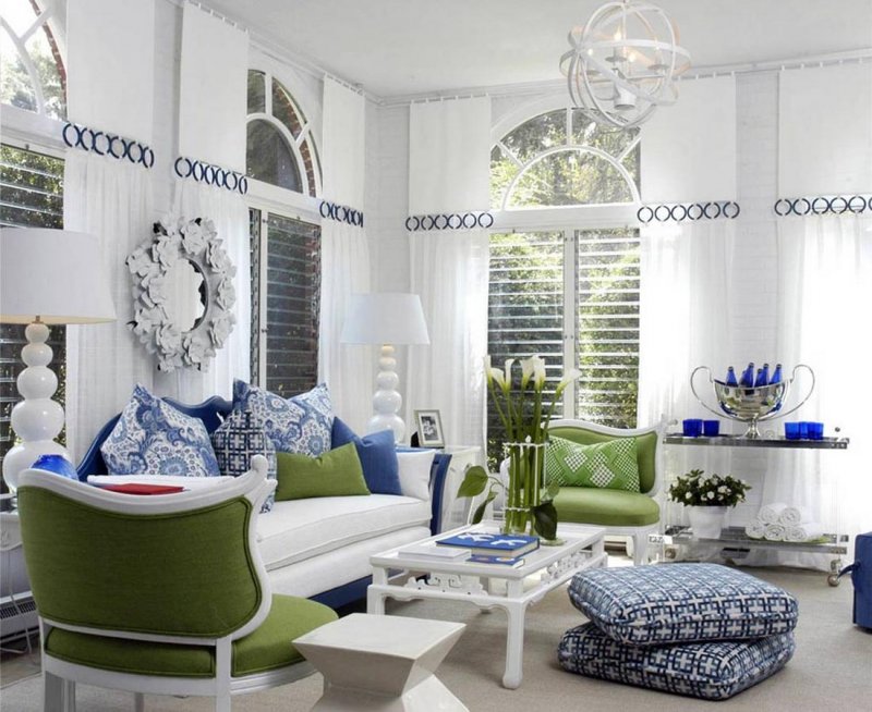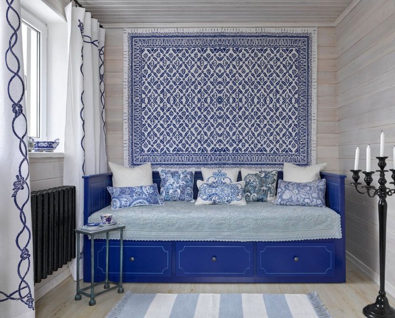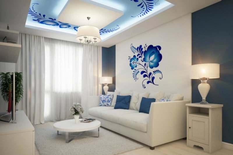 При оформлении гостиной гжельские узоры украшают преимущественно текстиль: обивку кресел, покрывало, подушки, коврик возле кровати, шторы. Стены отделывают деревом, окрашенным в белый цвет. Над изголовьем кровати размещают группу панно в рамках сложной конфигурации. Вместо прикроватных тумбочек используют легкие стеллажи с двумя полками. На столешницах располагают парные светильники с синими фарфоровыми «ножками» и белыми плафонами. Дополнительно комнату декорируют группами фаянсовых и стеклянных вазочек разных форм и расцветок (в рамках сине-бело-голубой гаммы). Тонкий полосатый коврик закрывает большую часть светлого паркета. Голубые шторы с ажурными краями комбинируют с легким, воздушным тюлем без рисунка.