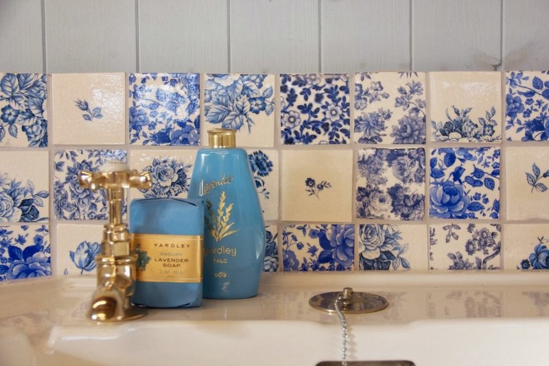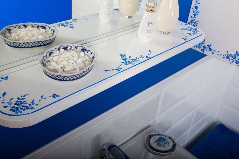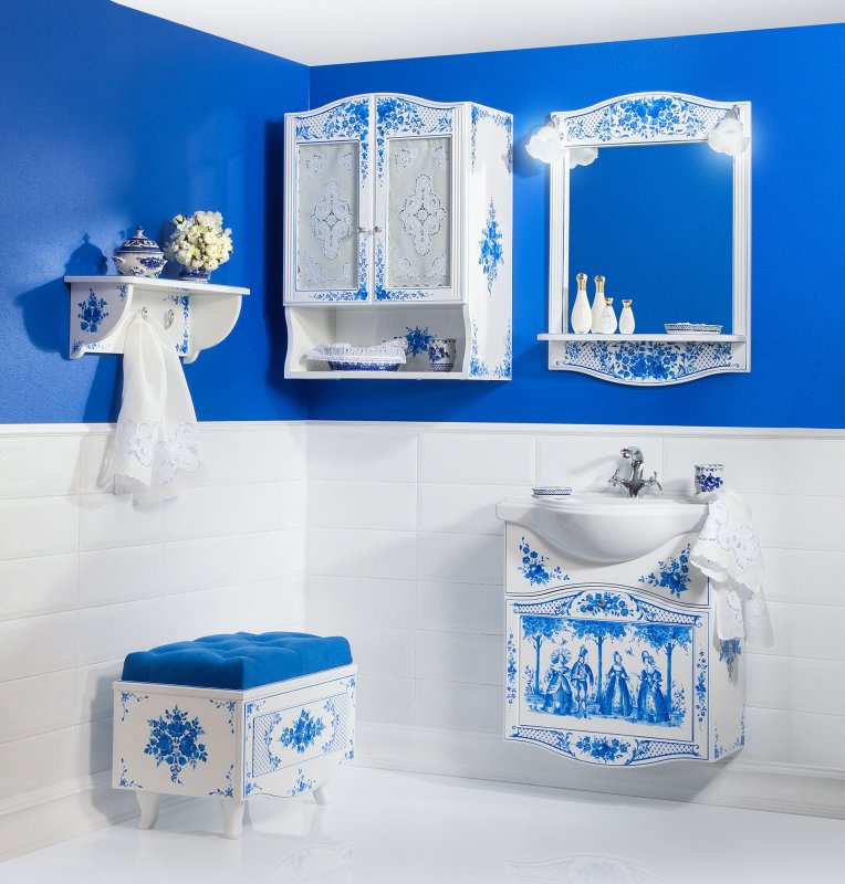 Гжельские узоры, нанесенные на поверхность кафельной плитки, идеально подходят для ванной комнаты. Во-первых, белый и синий считаются традиционными цветами для этого помещения. Во-вторых, плитку с тематическим узором достаточно легко найти. Подобное цветовое решение подойдет и для просторных ванных комнат в загородных домах, и для тесных совмещенных санузлов в квартирах. Чтобы все помещение не казалось аляповато изукрашенным, следует комбинировать кафель с орнаментом с белой плиткой и густо расписанной голубыми цветами. Дополняют интерьер синими полотенцами, светильниками и светло-коричневыми нотками (плетеная корзинка для белья, группы картин в рамках, тумба открытого типа).