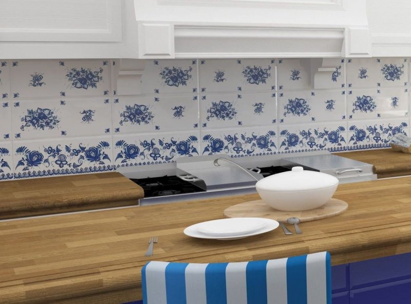 Гжельские узоры можно встретить на обоях, декоративных панелях и керамической плитке. Сине-белым узором декорируют стены и пол. Потолок преимущественно остается белым. Гжель рекомендуют вводить в интерьеры понемногу, грамотно сочетая узоры с тематическими картинами, которые украшают поверхность китайского или делфтского (голландского) фарфора. Обоями лучше оклеивать только одну стену или акцентную область. Причем крупный принт не подходит для тесных, маленьких комнаток. Остальные поверхности декорируют однотонными белыми, голубыми, серыми обоями. Гжель неплохо сочетается со светлой древесиной и легкой позолотой. Тематическую отделку комбинируют с элементами кантри, классического, скандинавского стилей. В последнем случае получается довольно необычный дуэт, нелишенный динамики.