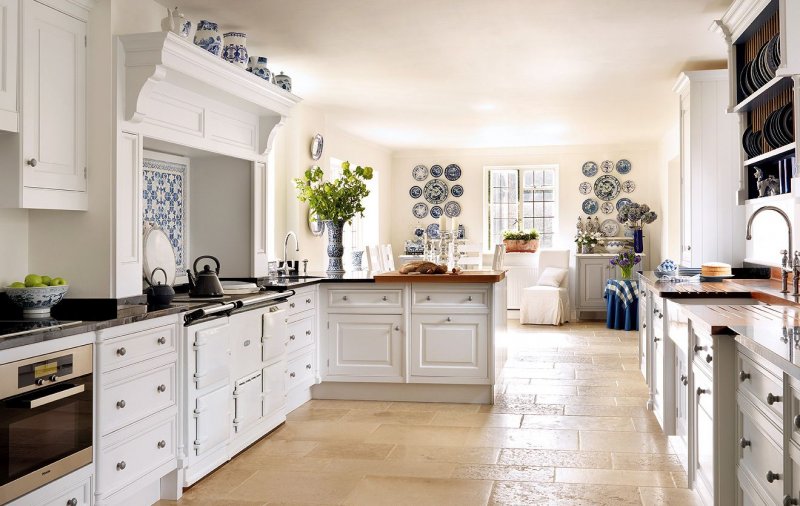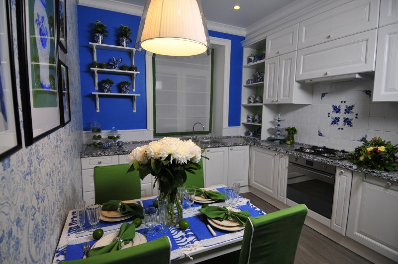 Гжель неизменно ассоциируется с кухнями, что неудивительно, ведь орнамент изначально использовался для декорирования посуды. Можно считать эти мотивы родными для данного помещения. Основу цветовой гаммы оформления кухни составят синий, голубой и белый цвет. Те самые оттенки, которые являются классическими для гжельской росписи. Так как кухня обладает сложным микроклиматом, в этой комнате пол и частично стены отделывают кафельной плиткой. Укладывают ее по сложной схеме. Для оформления акцентных областей (столовая зона, кухонный фартук) выбирают щедро изукрашенную плитку, а остальное пространство облицовывают белоснежным кафелем с легким голубым орнаментом. Остальную площадь стен декорируют белой, влагостойкой штукатуркой (можно фактурной). Белоснежный мебельный гарнитур с простенько оформленными фасадами будет перекликаться с обеденным комплектом (стулья и стол). Дополнительным цветом в этой композиции будет выступать серый.