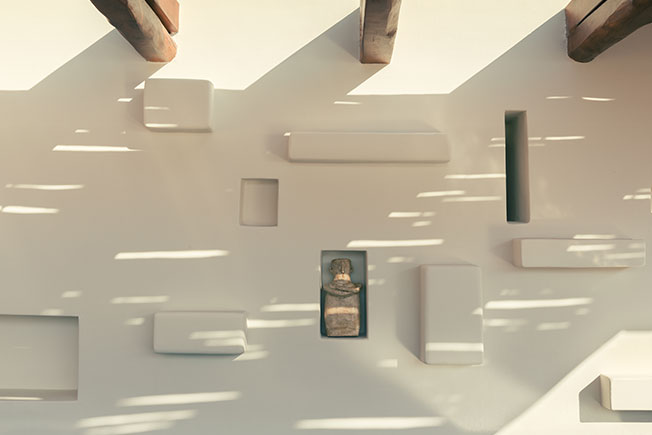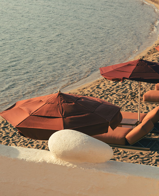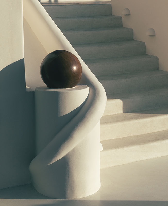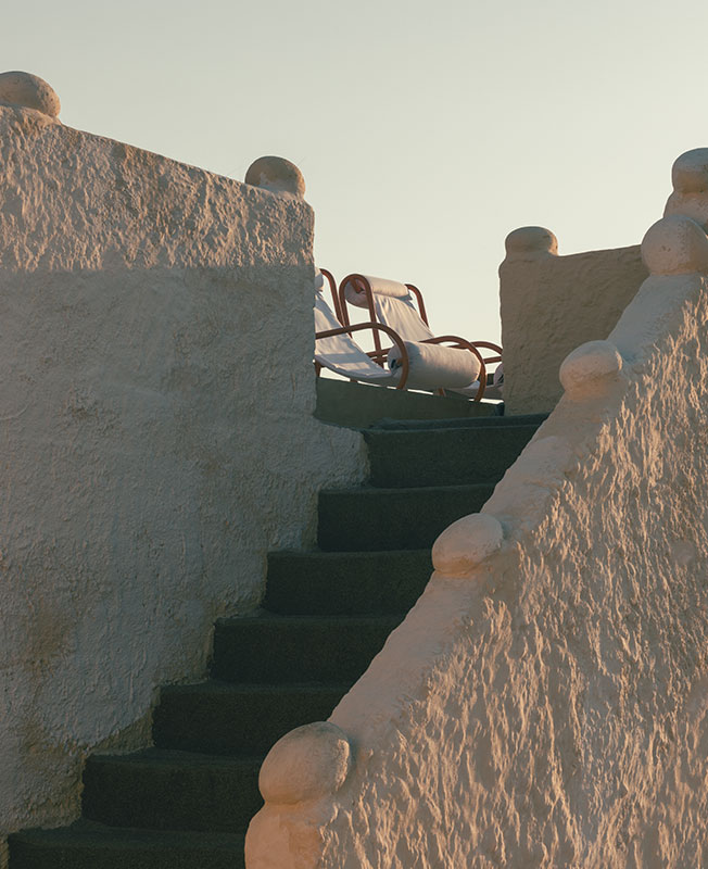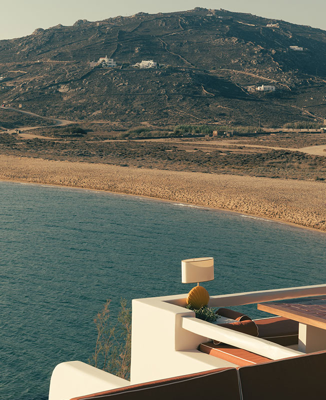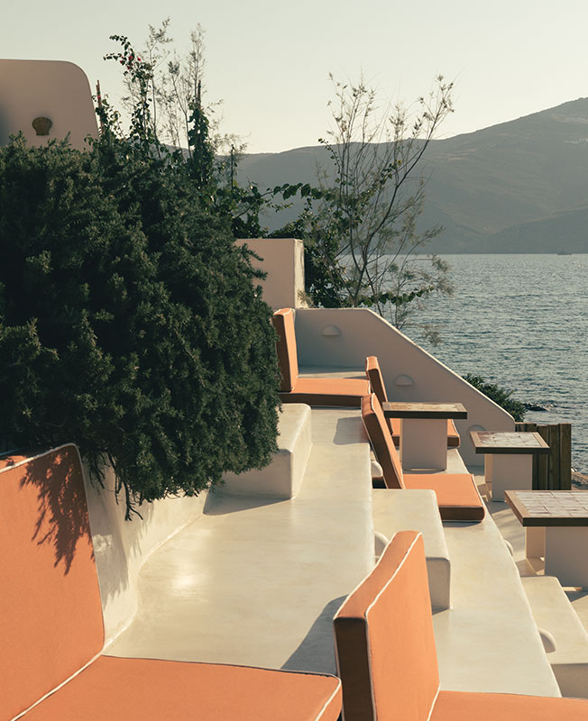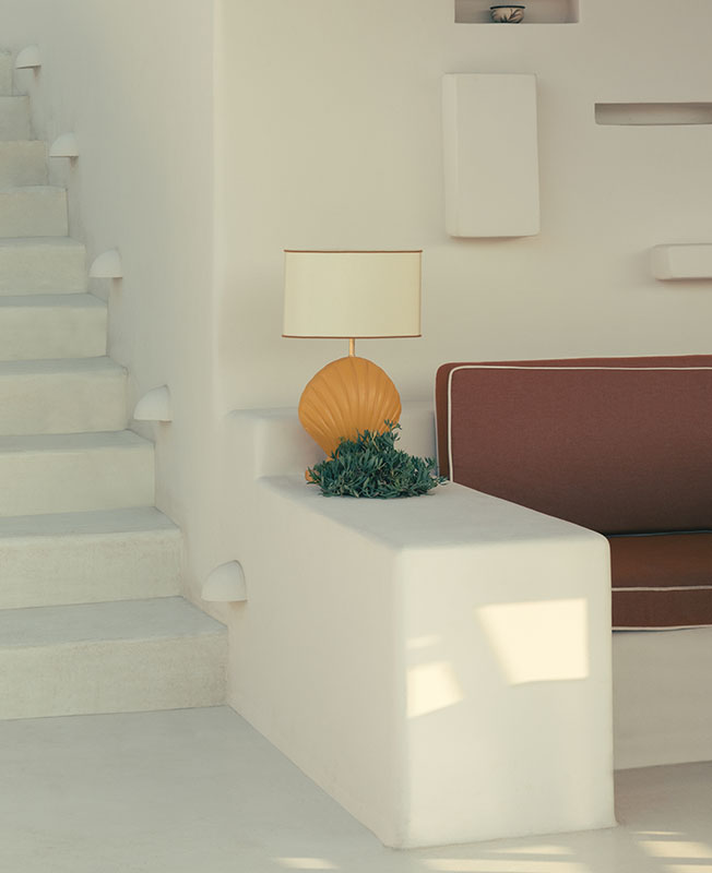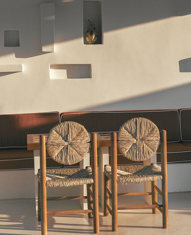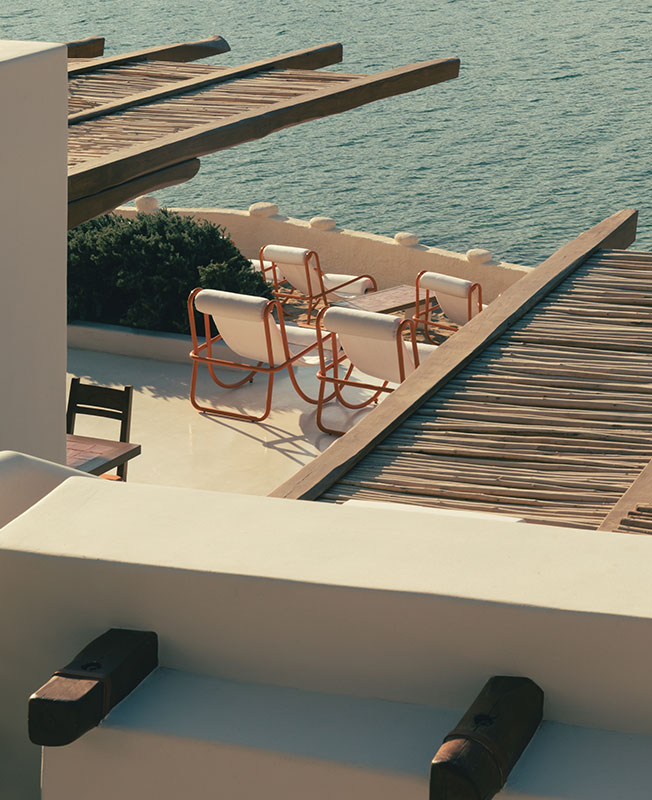 Дизайнер интерьеров Фабрицио Казираги предложил декор в красках места: его палитра колеблется между охристыми тонами и безупречной белизной. Настенные светильники в форме раковин, плетеные кресла, хлопоковые шезлонги вместе с культовой летней мебелью Locus Solus Гаэ Ауленти... Небрежная атмосфера, шикарная и расслабленная. Возможность жить по-гречески и восхищаться закатом на террасе.