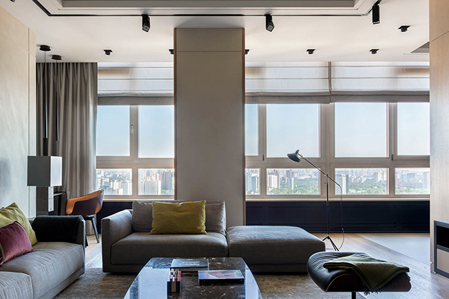 Работа над интерьером с нуля позволила сразу выявить и исправить архитектурно-строительные ошибки. Одно из достоинств квартиры — эффектный вид из окон. Но при этом невозможно было установить карнизы для штор, поскольку почти все створки открывались вплотную к потолкам. Об идее зашить гипсокартонными коробами систему вентиляции и кондиционирования тоже можно было забыть. Поэтому окна решили полностью заменить.
