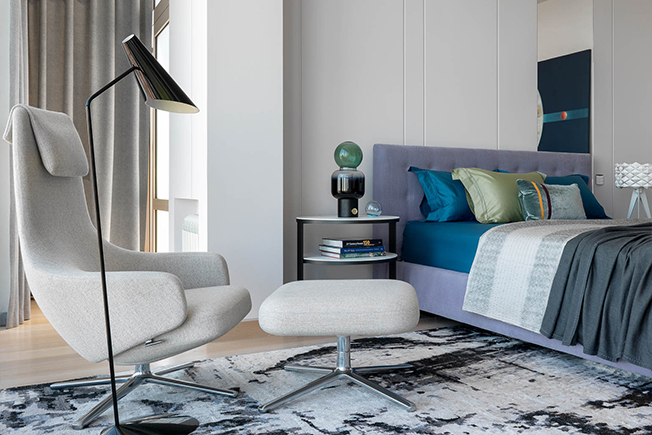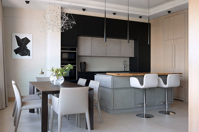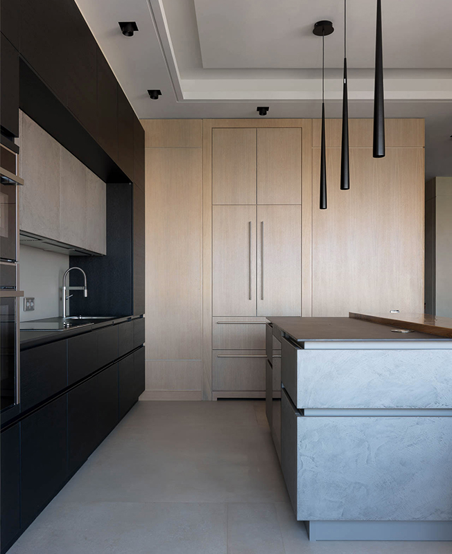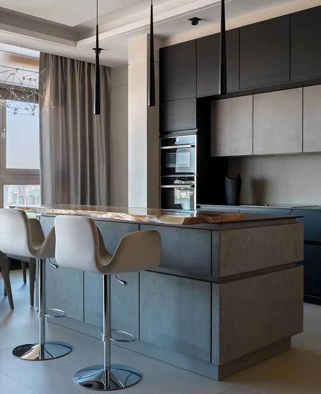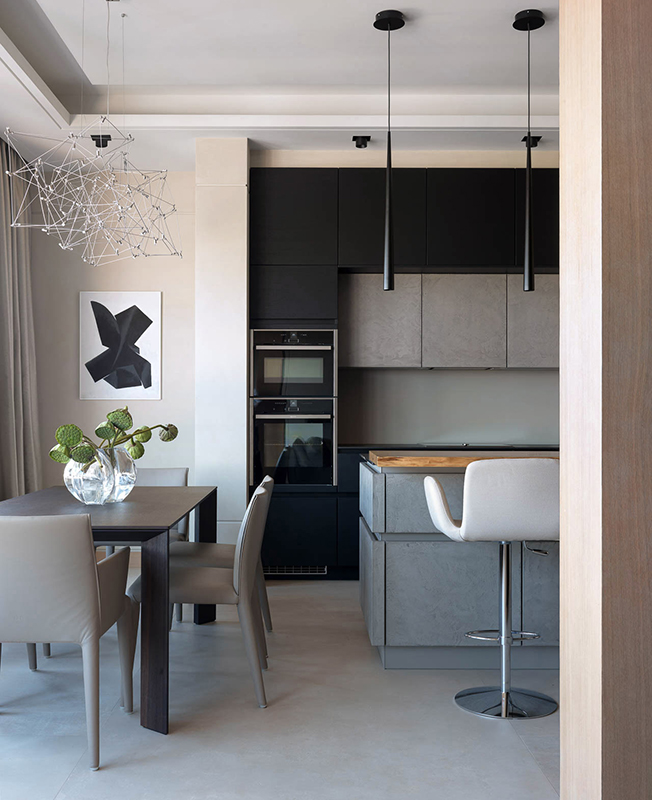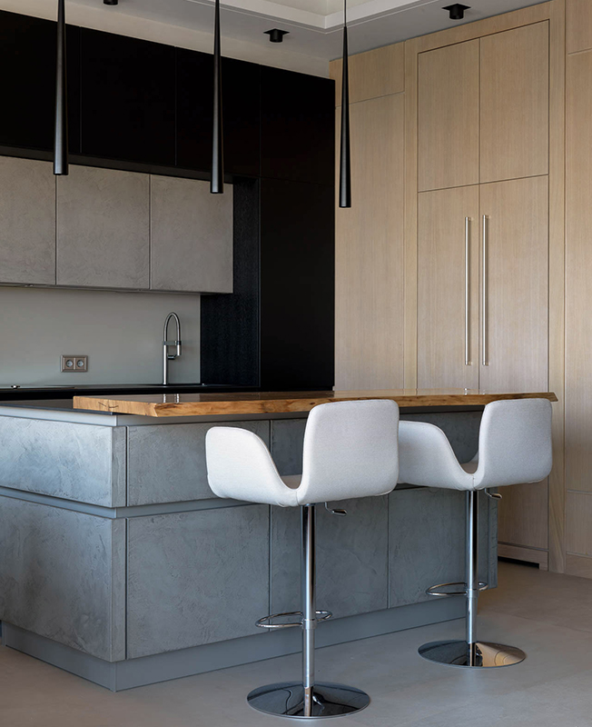 В итоге мы выявили основные признаки данного стиля и положили их в основу проекта. А именно — сдержанная палитра, серо-бежевая гамма, отсутствие лишних нефункциональных декоративных деталей и элементов, уютная обволакивающая атмосфера, качественные материалы, много натурального дерева, камня, текстиля. Это должен был быть интерьер, где у каждой вещи есть свое место, нет хаоса, беспорядка, что отражало, конечно, характер заказчика, организованного и аккуратного человека».
