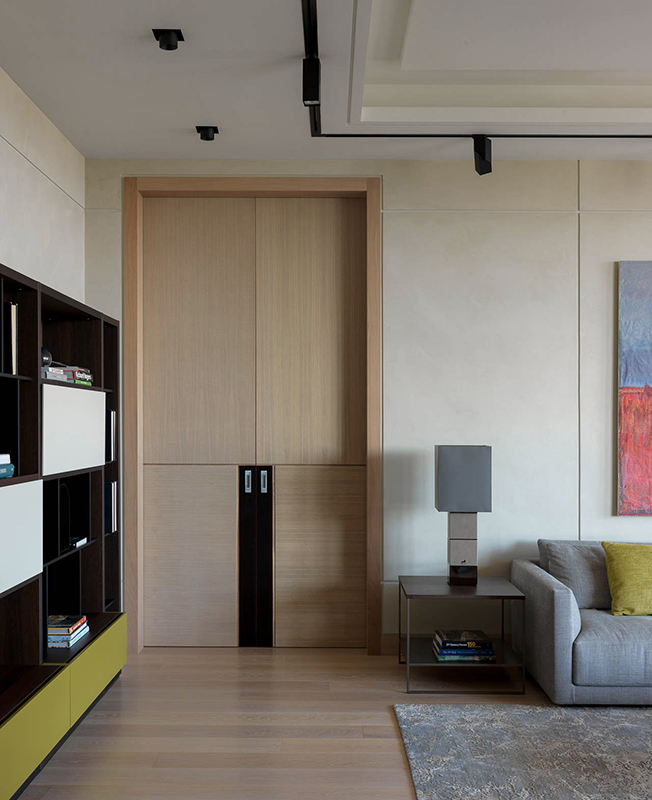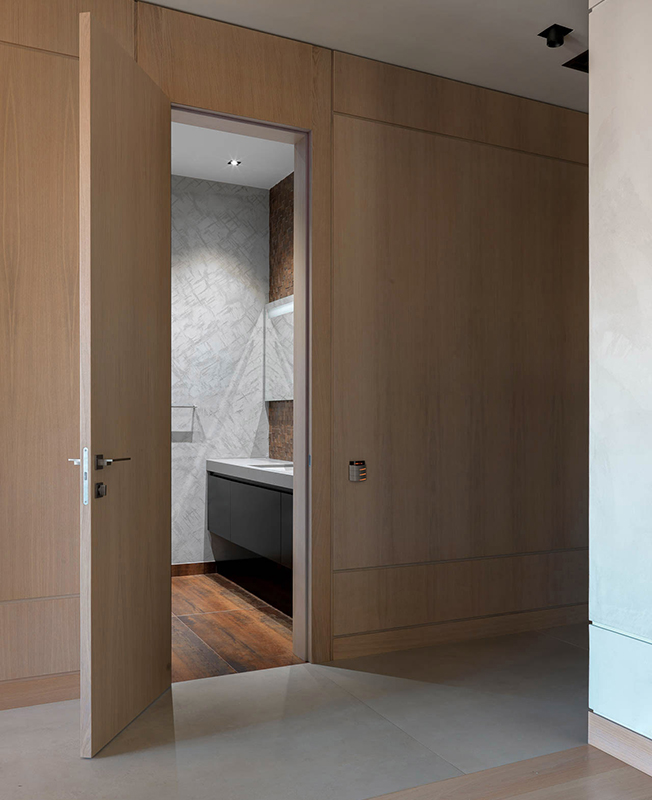 Поработать пришлось и над дверными приемами: их увеличили до 2,5 метров, поскольку при высоте потолков 3,4 метра входные двери были слишком низкими (2,2 метра). При входе в квартиру появился необходимый «пандус». «Застройщик не учел толщину пирога пола в квартирах и вывел чистовой уровень пола в лифтовом холле и плиту перекрытия в квартире в один уровень», — делятся авторы проекта.