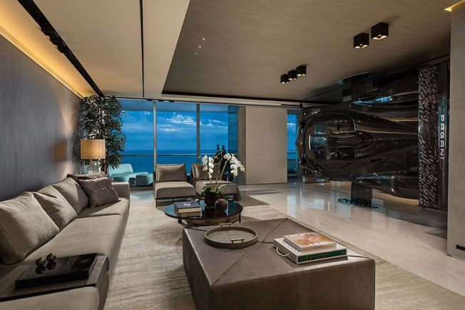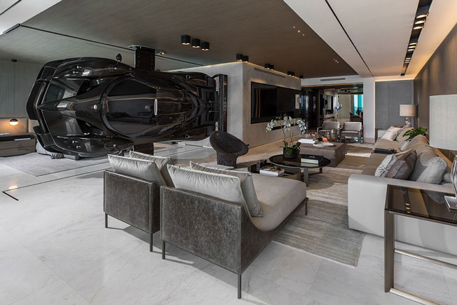 Аргентинский гонщик и плейбой Пабло Перес Компанк (Pablo Perez Companc) решил не расставаться с автомобилем даже дома. В своем пентхаусе в Майами он установил черный Pagani Zonda R стоимостью 1,5 миллиона долларов. Сын аргентинского промышленного магната и богатейшего гражданина своей страны, Пабло Перес Компанк является давним поклонником марки Pagani и коллекционером суперкаров. Pagani Zonda R — легендарный спортивный автомобиль, созданный итальянской компанией Pagani Automobili. За 12 лет производства, которое завершилось 2011 году, было выпущено не более 30 моделей, что, несомненно, многократно повышает ценность автомобиля. Примечательно, что конструкция Zonda R в основном состоит из углепластика, а значит, абсолютно безопасна для размещения в жилых помещениях. Конечно, это только кузов суперкара, «Зонда» — скорее произведение искусства. Установить машину в интерьере Пабло Перес Компанка помогла Finish My Condo, в партнерстве с Artefacto Home Staging. Несмотря на уникальные материалы, авто все же обладает внушительными габаритами и весом. Чтобы внедрить его в интерьер потребовался подъемный кран. Для монтажа автомобиля перпендикулярно полу был изготовлен суперпрочный стенд из алюминия и углеродистого волокна. Теперь Pagani Zonda R — это не только предмет желания поклонников спортивных гонок и ценный экспонат музейного уровня, но и предмет, который несет практическую пользу. Автомобиль в этом интерьере применили для зонирования — он отделяет спальню от просторной гостиной.