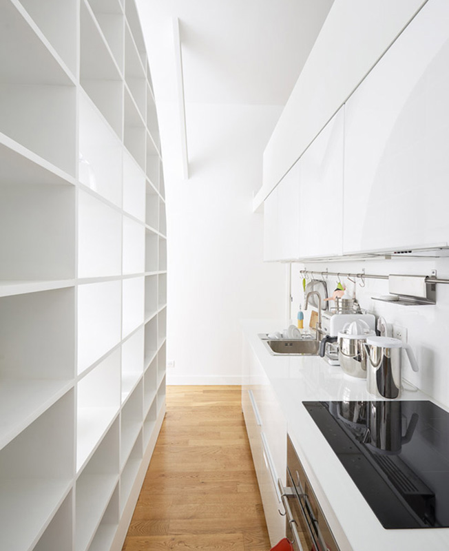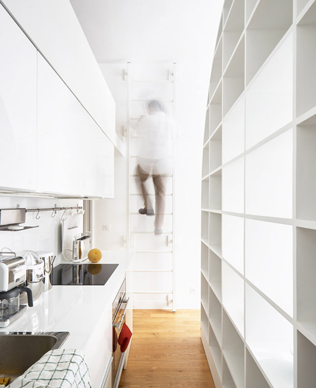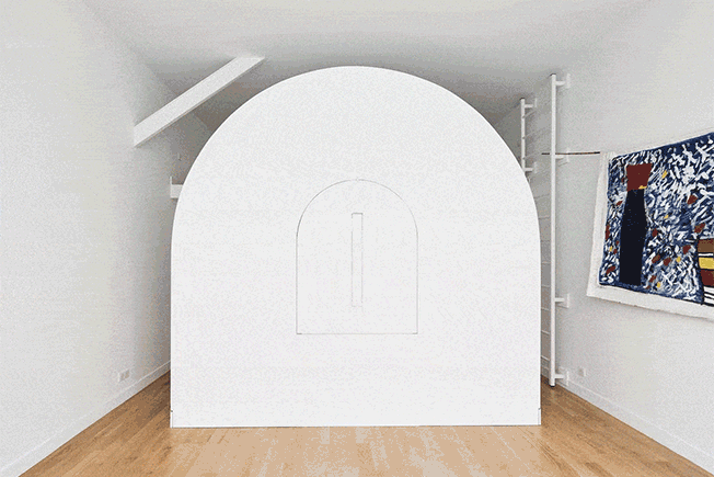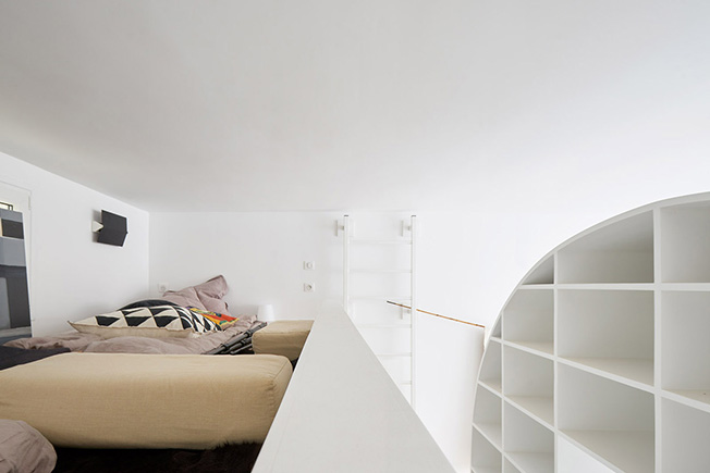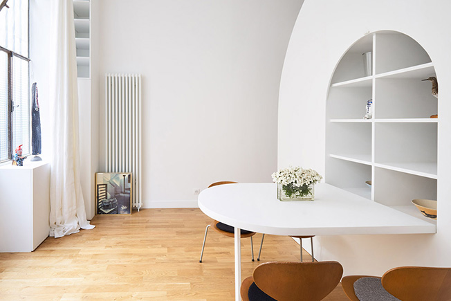 Французская студия Freaks Architecture придумала необычное решение для семейной пары, которое, однако, полностью соответствует их образу жизни. Апартаменты La Tournette расположены в 13-м округе Парижа и принадлежат двум архитекторам. П роводя большую часть своего времени во французской деревне, они обратились к Freaks Architecture, чтобы преобразовать свои скромные городские метры бывшей мастерской в квартиру, где могли бы с комфортом проводить выходные. Заказчики хотели, чтобы пространство было достаточно универсальным, чтобы можно было устраивать дружеские ужины, разместить двух взрослых дочерей, когда они наведываются в гости и, наконец, не забыть о месте для работы. Все пожелания надо было учесть, располагая скромными 30 метрами. Один из клиентов хорошо знаком с театральными проектами, поэтому идея вращающегося элемента показалась очень соблазнительной. На одной стороне этого уникального арочного объекта есть стеллаж, в то время как на другой — раскладной обеденный стол и, если он повернут к кухне, то может служить дополнительным рабочим столом. В интерьере бывшей мастерской — высокие потолки. Это дало возможность создать спальню на втором ярусе, над частью кухонной зоны и ванной комнатой. Исключая деревянный пол, все поверхности в квартире окрашены в белый цвет, чтобы иметь нейтральный фон для произведений искусства, декоративных объектов и мелких деталей.
