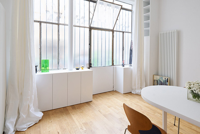 В интерьере бывшей мастерской — высокие потолки. Это дало возможность создать спальню на втором ярусе, над частью кухонной зоны и ванной комнатой. Исключая деревянный пол, все поверхности в квартире окрашены в белый цвет, чтобы иметь нейтральный фон для произведений искусства, декоративных объектов и мелких деталей.
