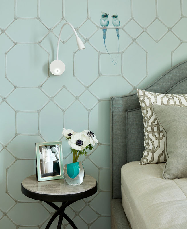 В спальне по эскизам дизайнера выполнены стеновые панели и кровать. Бра Elkins Sconce, диз. Томас О’Брайен, Visual Comfort Gallery.
