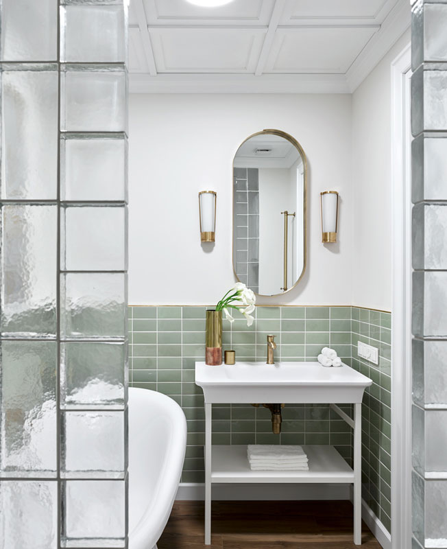 В гостиной кресло марки Roche Bobois. Консоли Latuning. Бра Visual Comfort Gallery. Над камином — работа художника Джорджо Сильвестрини «Кактус», «Мастерская Кати Гердт». Дизайнер Олеся Федоренко оформила квартиру в Москве для родителей заказчиков. Вкусы двух поколений различались незначительно — в приоритете был интерьер в сдержанной стилистике, который молодые хотели оживить яркими красками. Квартира в Хамовниках обладала рядом преимуществ, например, прекрасным видом на парк усадьбы Трубецких. Но была в плачевном техническом состоянии и требовала серьезного конструктивного обновления. В гостиной по эскизам дизайнера выполнен стеллаж. Зеркала Alexey Tiskin. Диван Profile, Roche Bobois. В гостиной комод выполен по эскизам дизайнера в мастерской Alexey Tiskin. Торшер Kelly Wearstler. Во время демонтажа обнаружились скрытые коммуникации, которые сильно повлияли на согласованный проект. Был проработан новый план, по которому на 88 кв. метрах все же удалось разместить все необходимые для комфортной жизни функциональные помещения — гостиную, столовую, кухню, гардеробную, две спальни и два санузла. В столовой стол и стулья BoConcept. Люстра Valerie Chandelier от Arteriors Home. Дверные ручки изготовлены на заказ Soda Homedecor. Так как квартира должна была стать сюрпризом для старшего поколения, детали и нюансы оформления дизайнер обсуждала с молодыми заказчиками. Результат оправдал ожидания всех членов семьи и был принят с восторгом. На кухне фартук из керамической плитки ручной работы от Original Style. Подвесные светильники Handle Studio. Кухонный гарнитур и двери выполены по эскизам дизайнера в столярной мастерской «Виктори». Дизайнер Олеся Федоренко рассказывает о работе над проектом: «Палитра построена на цветовых нюансах, где важную роль играет искусство. Художественные работы дополняют друг друга. Уже из прихожей сквозь стеклянные двери просматривается фрагмент картины Дарьи Барыбиной «Куклы». Она стала фокусной точкой столовой. Вторым акцентом в интерьере является работа «Кактусы» Джорджо Сильвестрини». В спальне по эскизам дизайнера выполнены стеновые панели и кровать. Бра Elkins Sconce, диз. Томас О’Брайен, Visual Comfort Gallery. Стены в спальне покрашены краской Zoffany. Оттенок Tuscan Pink. Следуя пожеланиям молодых заказчиков, которые хотели ярких оттенков, дизайнер филигранно ввела в интерьер бирюзовый — он представлен в обивке кресел и в оформлении кухни. Эксперименты с цветом особенно очевидны в интерьерах двух спален. В одной из спален кресло Gusto Soft по дизайну Антонио Читтерио от Flexform. Туалетный столик Ren, Potrona Frau. Бра Alice, Visual Comfort Gallery. Ковер The Rug Company. «Чтобы добиться большей глубины, мы комбинировали оттенок Tuscan Pink от Zoffany с более светлым, акварельным China Clay от Little Greene, — вспоминает Олеся Федоренко. — Для второй спальни выбрали обои ручной работы мятного оттенка. Рисунок с птицами выполнен художником по готовым и поклеянным на стены обоям. В одной из спален обои ручной работы от Fresq.ru расписаны уже по стенам художником. Все краски и материалы сертифицированы по экостандартам. В основе проекта — принцип осознанной экологичности: мы следим за тем, чтобы не наносить вреда здоровью и природе». Ванная комната. Зеркало, Kelly Wearstler. Ванна Roxburgh, Astra-Form. Раковина Agape.