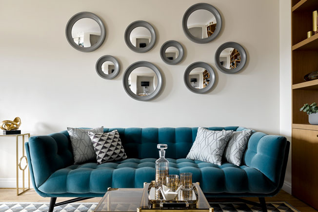 В гостиной по эскизам дизайнера выполнен стеллаж. Зеркала Alexey Tiskin. Диван Profile, Roche Bobois.
