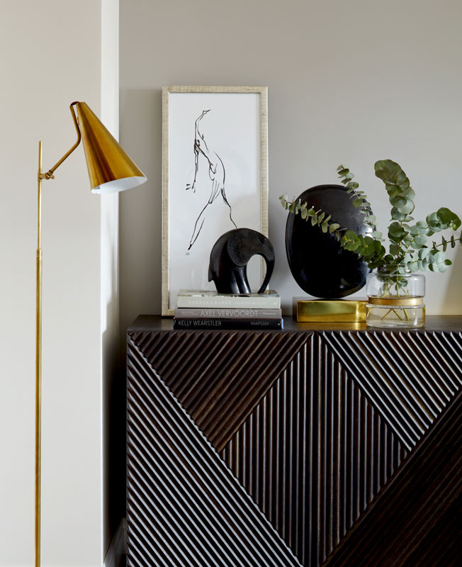 В гостиной комод выполен по эскизам дизайнера в мастерской Alexey Tiskin. Торшер Kelly Wearstler.