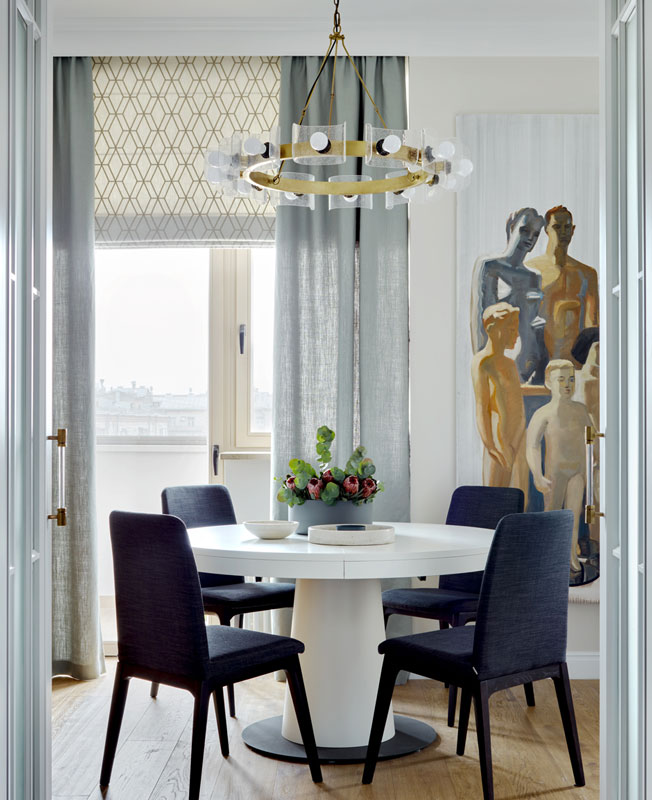Дизайнер Олеся Федоренко рассказывает о работе над проектом: «Палитра построена на цветовых нюансах, где важную роль играет искусство. Художественные работы дополняют друг друга. Уже из прихожей сквозь стеклянные двери просматривается фрагмент картины Дарьи Барыбиной «Куклы». Она стала фокусной точкой столовой. Вторым акцентом в интерьере является работа «Кактусы» Джорджо Сильвестрини».