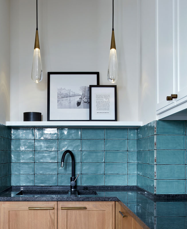 На кухне фартук из керамической плитки ручной работы от Original Style. Подвесные светильники Handle Studio.