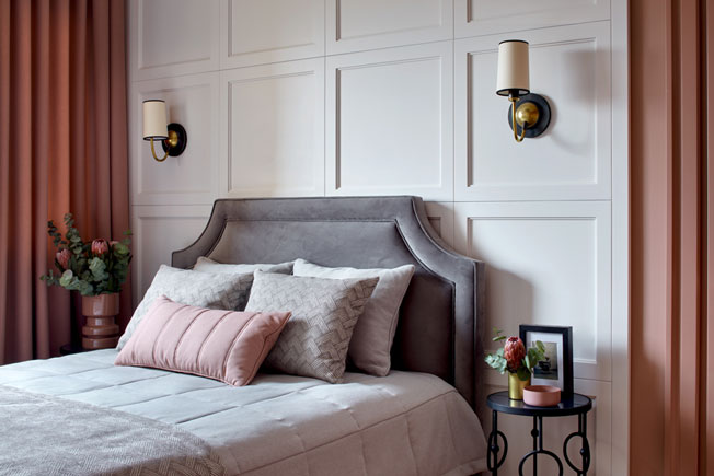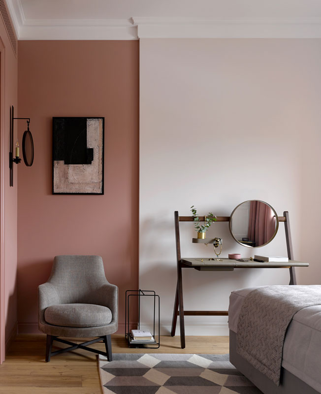 Стены в спальне покрашены краской Zoffany. Оттенок Tuscan Pink.
