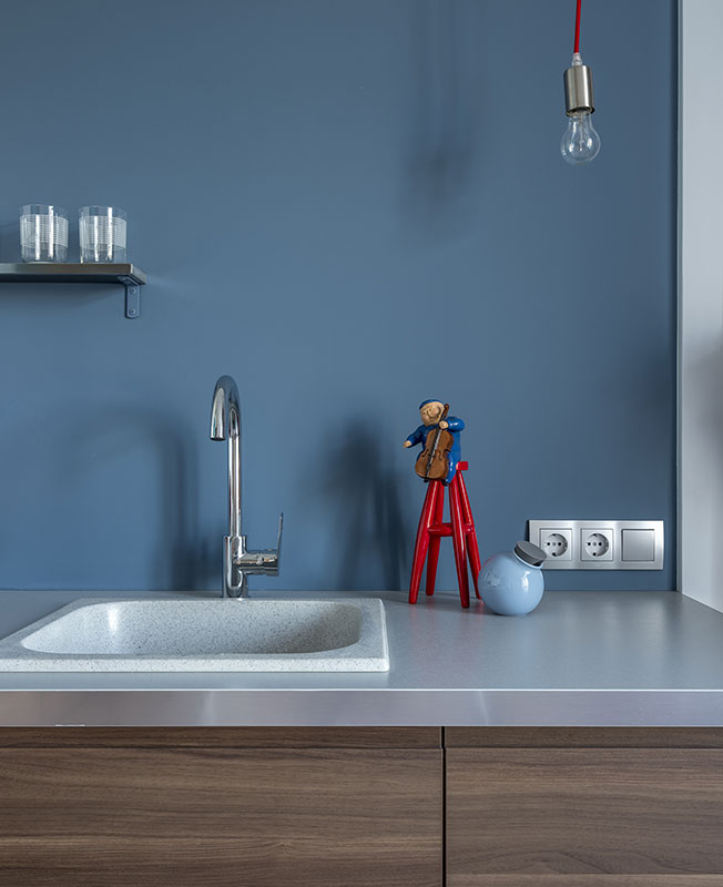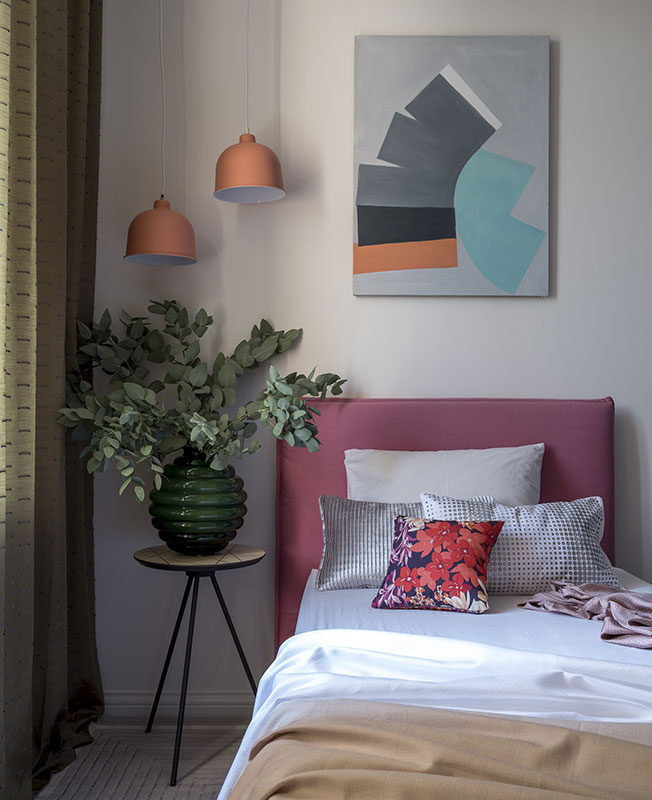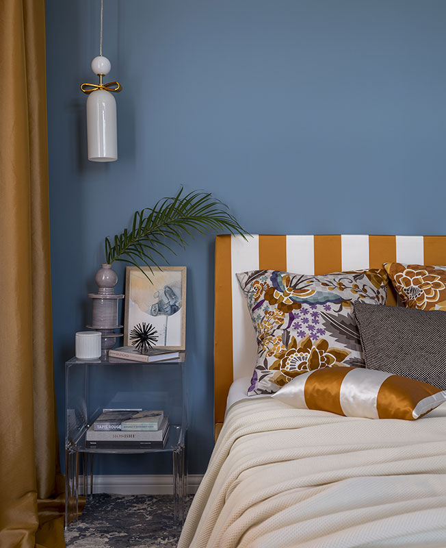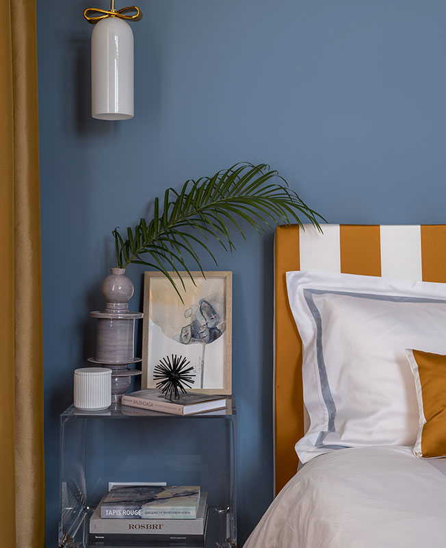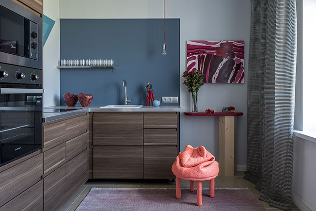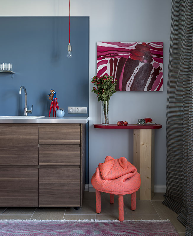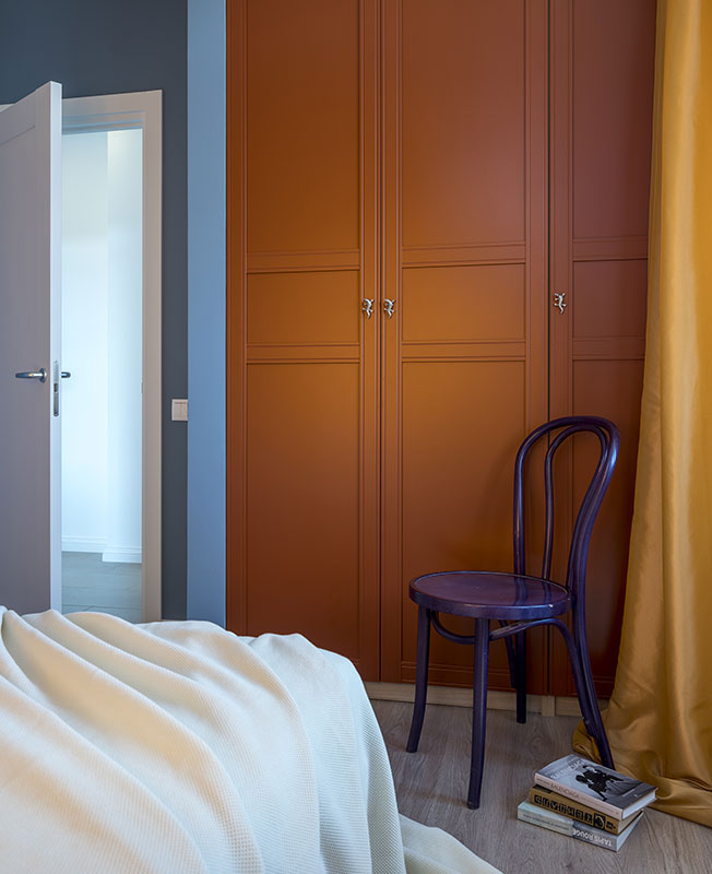 Заказчикам нравятся яркие краски, любит их и Ольга. Дизайнер убеждена, что если применять цвет правильно, он становится отличным средством расширения прространства. «Гармонично подобранные цветовые акценты отвлекают внимание от небольшой площади, зрительно укрупняют масштаб. А вот тотальные светлые тона маленьким комнатам не показаны — сжимают их еще больше. В данном проекте я подбирала палитру на основе контрастных цветов: голубой и золотистый, голубой и оранжевый для мастер-спальни, розовый и серо-зеленый для детской, синий и красный для кухни».