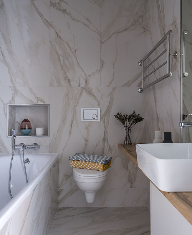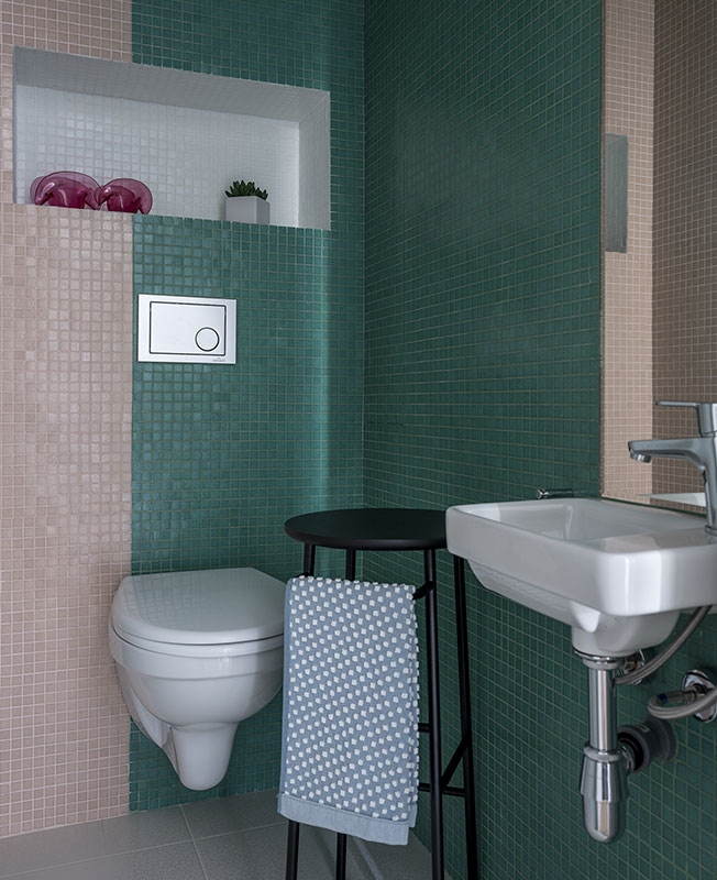 Для ванных комнат приобрели сантехнику Laufen — у знаменитого швейцарского бренда есть недорогие модели. Большой санузел отделан бюджетной плиткой российского производства, которая имитирует мрамор: благодаря крупному формату она выглядит благородно и более дорого, чем если была бы мелкого размера. Стеклянная мозаика, купленная на распродаже, сделала второй, малый, санузел ярким и уютным. «Остатки коллекций, снятых с производства, часто можно приобрести по доступной цене. Главное, чтобы заказчик прислушивался к советам, следовал рекомендациям людей с опытом».