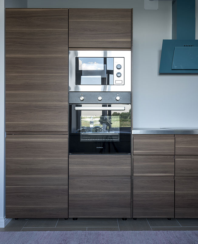 Кухню немного увеличили за счет коридора и спальни. Это удалось, поскольку квартира находится на втором этаже, а под ней — нежилой первый. В результате были сформированы основные помещения: 12-метровая кухня-столовая и две спальни по 10 кв. м каждая. Плюс два санузла, большой и малый, 3,1 и 1,2 кв. м соответственно, а также четыре больших шкафа: три для одежды и один хозяйственный, где разместили в среди прочего стиральную машину.