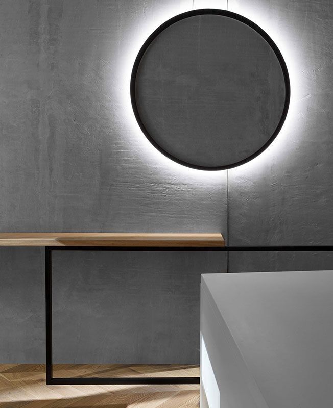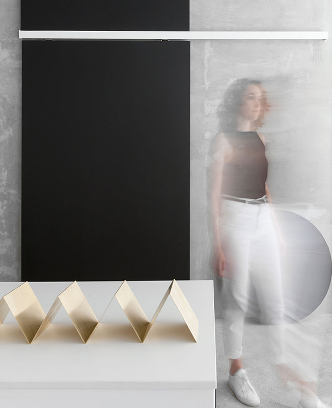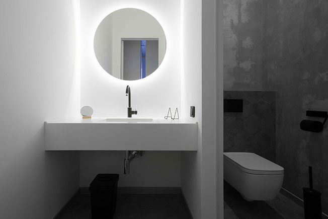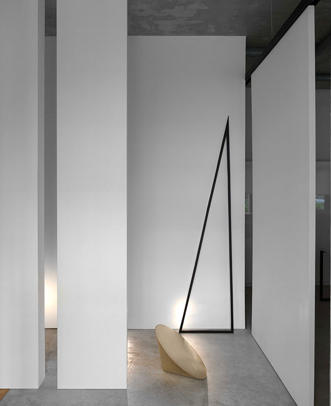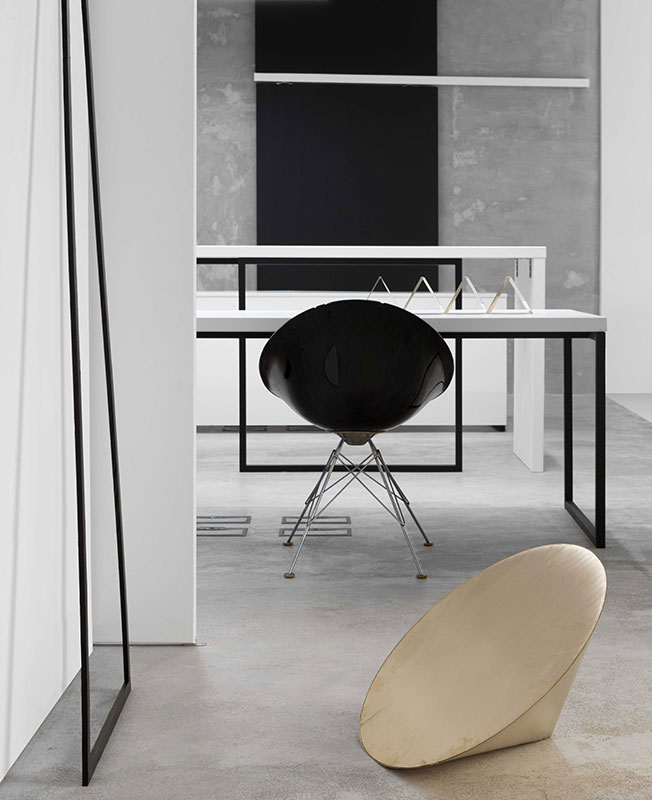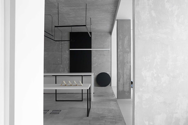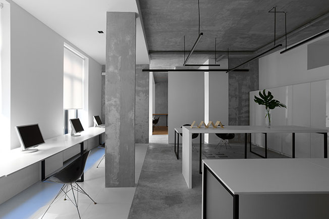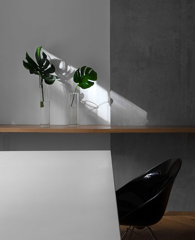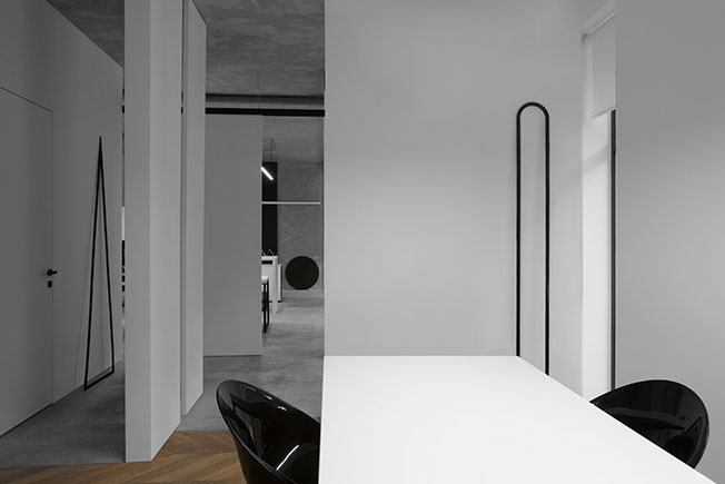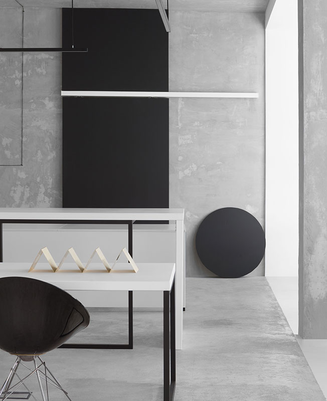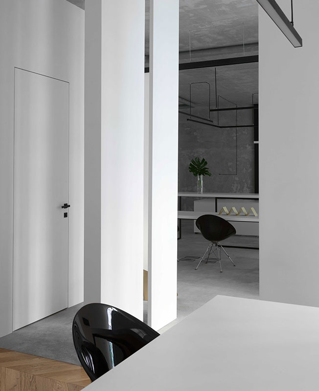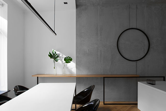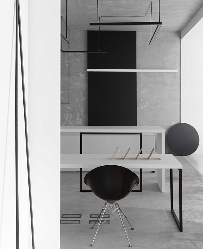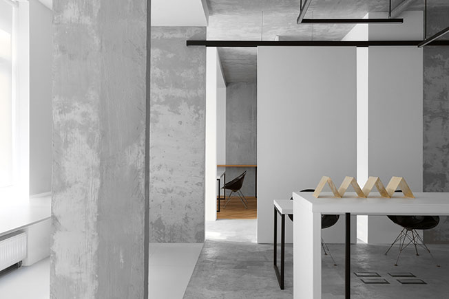 Выразительный материал продиктовал и выбор палитры. Ничего лишнего: серые фактурные стены, пол и потолок служат фоном для рабочих зон, выделенных белым цветом. Прохладную гамму смягчает теплый оттенок паркета и деревянной столешницы в одном из помещений. Двери и почти все предметы мебели были выполнены на заказ по эскизам архитекторов: столы, стеллажи, светильники. Декоративные элементы изготовили своими руками. «Графические контуры предметов и светильников в сочетании с аксессуарами из латуни создают особую магию геометрических форм», — комментируют авторы проекта. ?