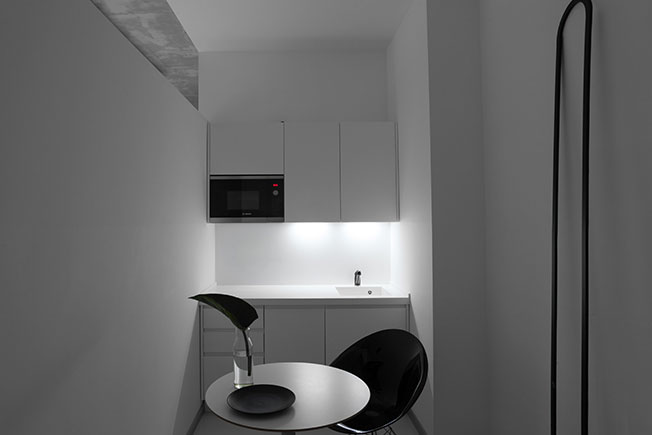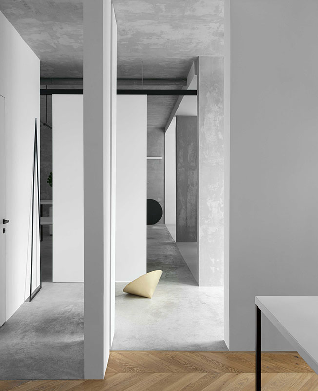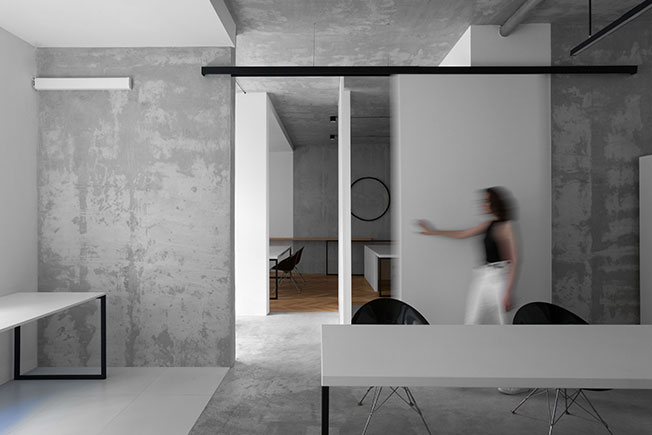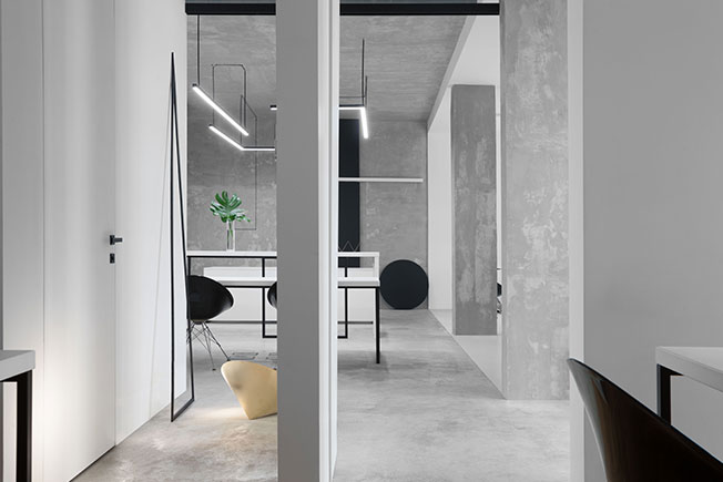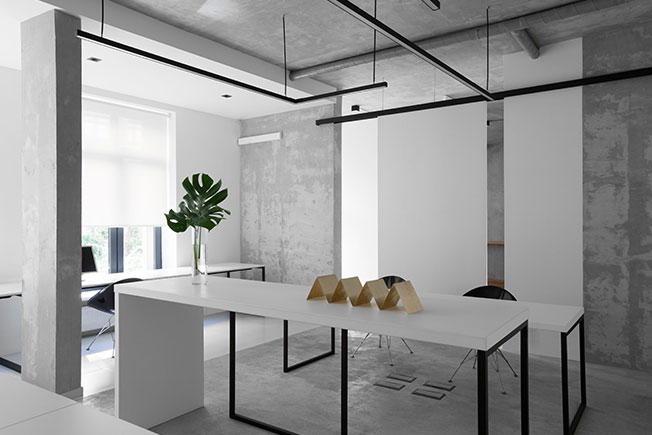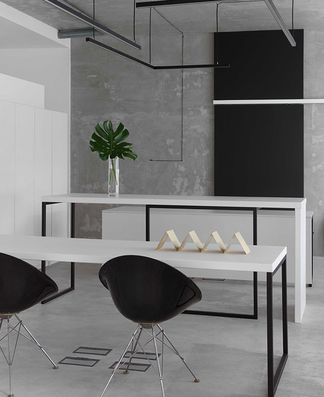 Основная концепция интерьера была придумана сразу. Когда попадаешь в пустое, нетронутое помещение, сразу понимаешь, что и где нужно оставить или убрать. Изначально стены здесь были из трех материалов: кирпича, бетона и гипсовых блоков. Мы решили взять за основу один — бетон. На его фоне функциональные зоны обозначены поверхностями и деталями белого и черного цветов. Бетон в сочетании с гладкими белыми поверхностями стен перетекает в плоскости потолков, столов и перегородок».