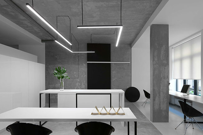 «Гордимся тем, что удалось спроектировать красивое полугалерейное пространство. Офис взял уже несколько крупных наград. В 2017 году он стал лауреатом в международном фестивале «Зодчество» в номинации «Общественный интерьер». Ирина Мавродиева и Артур Гога, основатели AMG-project, спроектировали офис в Москве для себя и своих сотрудников. Участие в работе над проектом принимала Анна Гога. «Помещение нашего нового офиса предоставило нам прекрасную возможность сделать что-то необычное и в то же время функциональное для себя, — говорят Ирина Мавродиева и Артур Гога. — Хотелось создать особую творческую атмосферу для нашего дружного коллектива. Обстановка в офисе должна быть не только комфортной, но и отражающей сферу деятельности компании. Мы разрабатывали интерьер, в котором предстояло работать именно нам, поэтому учитывали пожелания всех сотрудников компании и принимали решения коллективно». На площади 140 кв. метров требовалось обустроить помещения с разным функционалом. Для этого пространство зонировали с помощью мобильных перегородок. «С их помощью можно изолировать любую часть общего пространства и превратить ее в комнату для переговоров, к примеру. Или использовать как кабинет для индивидуальной работы, — рассказывают архитекторы. — Отдельные помещения достались только кухне, кладовой и санузлам. Помимо переговорных, в которые с помощью мобильных перегородок можно превратить любой фрагмент общего пространства, есть в офисе и место для неформального общения — это барная стойка, за которой можно обсудить детали проекта между собой или с заказчиком. Основная концепция интерьера была придумана сразу. Когда попадаешь в пустое, нетронутое помещение, сразу понимаешь, что и где нужно оставить или убрать. Изначально стены здесь были из трех материалов: кирпича, бетона и гипсовых блоков. Мы решили взять за основу один — бетон. На его фоне функциональные зоны обозначены поверхностями и деталями белого и черного цветов. Бетон в сочетании с гладкими белыми поверхностями стен перетекает в плоскости потолков, столов и перегородок». Выразительный материал продиктовал и выбор палитры. Ничего лишнего: серые фактурные стены, пол и потолок служат фоном для рабочих зон, выделенных белым цветом. Прохладную гамму смягчает теплый оттенок паркета и деревянной столешницы в одном из помещений. Двери и почти все предметы мебели были выполнены на заказ по эскизам архитекторов: столы, стеллажи, светильники. Декоративные элементы изготовили своими руками. «Графические контуры предметов и светильников в сочетании с аксессуарами из латуни создают особую магию геометрических форм», — комментируют авторы проекта. ? «Только когда мы начали обживать новое пространство, поняли, каким именно хотим его видеть. Так мы решили дополнить интерьер геометричными декоративными фигурами. Для нас самымми главнымы были настроение и атмосфера, которые будут в офисе. В итоге работается здесь очень комфортно! Окружающая обстановка вдохновляет на новые идеи. Стоит отметить, что офис нравится не только самим сотрудникам, но и людям в прямом смысле с улицы: часто прохожие, увидев в окнах светящиеся геометрические фигуры, звонят в дверь и интересуются, что у нас здесь происходит».