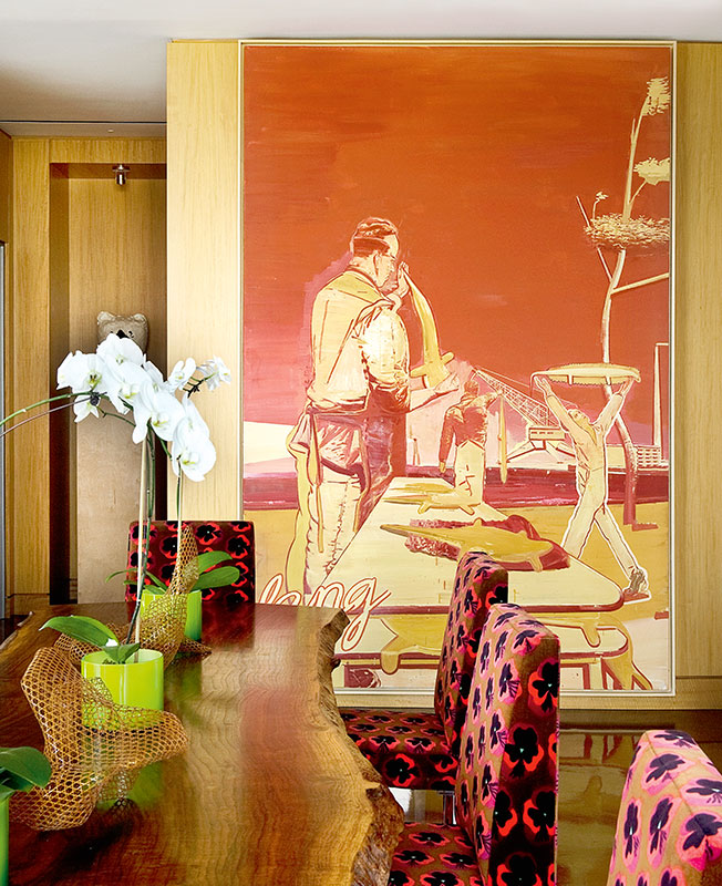 Гостиная. Над диваном большое живописное полотно 1+1=2. Автор — японский художник М. Аида. Слева скульптура Sound Suit Н. Кейв. Восклицательный знак справа в углу — скульптура Р. Артшвагера. Диван В. Кагана, 1960-е. Кресло дизайна Garouste & Bonetti, 1990.
