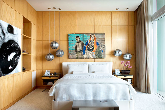 Спальня — На светлых панелях выигрышно выглядит работа Visionary из алюминиевой и медной проволоки. Автор — нигериец Эль Анацуи (р. 1944). Столик Тripod Тable — работа М. Накашимы из капа клена «птичий глаз».