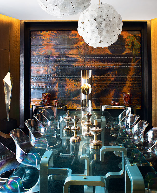 Столовая поражает воображение. Вокруг стола из стекла и стали 1970-х — стулья Champaigne, диз. Э. и Э. Лавернь. Металлическая колонна, диз. М. Пергей. Панно из протравленной кожи, диз. П. Сабатье.