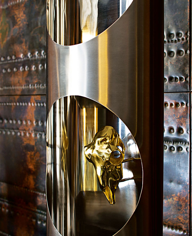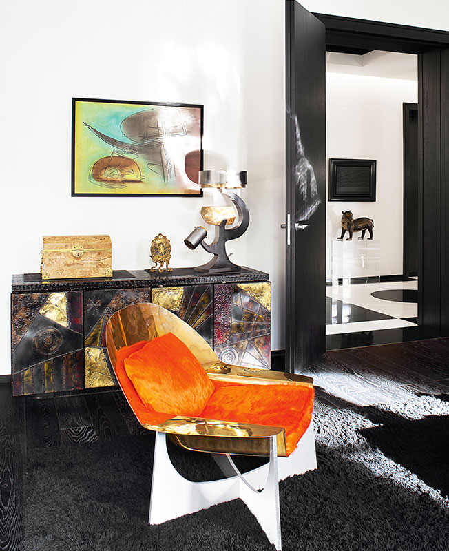 Обычно свои безупречные композиции Гасту располагает в белых коробках, рассчитывая на то, что предметы скажут всё сами за себя. Однако в этом проекте хозяйка настояла на сложном цвете. Поэтому все комнаты решены в два тона: стены глухих коричневых тонов сочетаются с белыми. Особенно стильно темные стены выглядят в тех помещениях, где они поддержаны таким же цветом на полу и в мебели. Лучший образец — малая гостиная, выходящая в сад. В темных интерьерах люксово и солидно смотрится металл: скульптуры и предметы Марии Пергей (р.1930), Филиппа Икили (1925–2013), Пола Эванса (1931–1987), Адо Шаля (р. 1928). В доме устроен настоящий праздник металлических фактур.