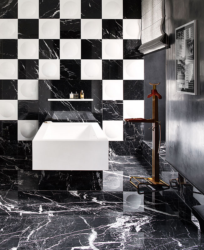 Ванная развивает черно-белую тему, а также мотив круга. Стены и пол отделаны мрамором, гладкая плитка чередуется с рельефной, имеющей круглые углубления. Дизайн раковины придумали архитектор и заказчица. На стене гуашь Ж. Коллиньона.