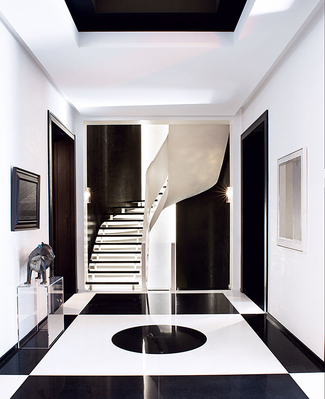 Холл-прихожая решена в строгом монохроме. На полу черный и белый мрамор. Лестница и рисунок пола — проект А.-Д. Галлиции. На стенах работы П. Сулажа.