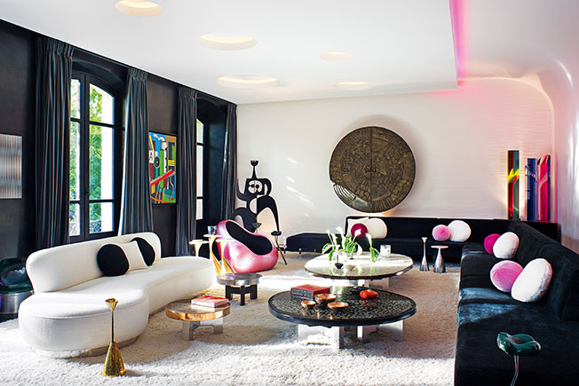 Гостиная. Белый диван Serpentine, диз. В. Каган, 1975. Два столика, диз. А. Шаль. Розовое кресло, диз. К. Рашид. На стене диск П. Эванса, три колонны из плексигласа, диз. Ж.-К.Фархи.