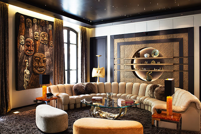 В доме собраны все характерные атрибуты стиля 1970-х. Во-первых, материалы — плексиглас, сталь, латунь, пластик, алебастр, стекло, горный хрусталь. Во-вторых, черно-белый декор: эта тема идеально разыграна в прихожей и в ванной комнате, однако читается и в других помещениях. И наконец, мотив круга — Гасту подобрал много шарообразных светильников, круглые кресла и арт-объекты, а архитектор Ален-Доминик Галлиция придумал декорировать потолки в парадных помещениях круглыми отверстиями с подсветкой. Все это напоминает футуристичную «Космическую одиссею» Стенли Кубрика — культовый фильм 1968 года, который значительно повлиял на интерьерный декор 1970-х.