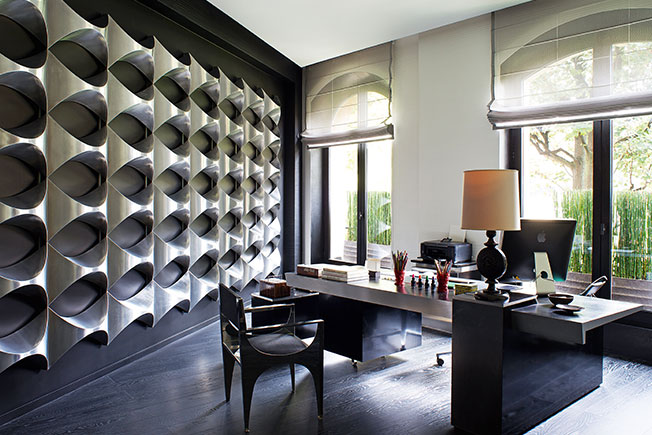 Рабочий кабинет бравирует люксовой строгостью. Стальное панно, 1970. Письменный стол, диз. В. Риццо. Кресло, диз. Ф. Икили.