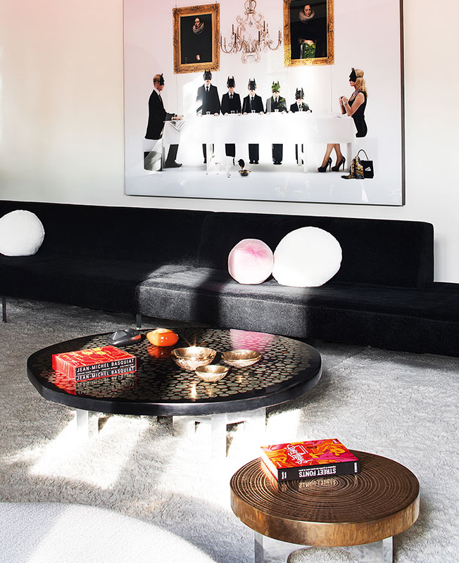 В гостиной интересен диалог современного искусства и дизайна. Над большим диваном (проект хозяйки, реализация Studio 2B) — работа Batman Family Ж. Рансинана. Столики из бронзы и смолы, диз. А. Шаль.