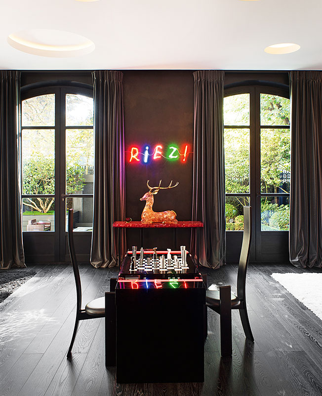 Малая гостиная подчеркнуто пуста. В центре стол Backgamon, диз. Ж.-К.Фархи. Стулья, диз. В. Маджистретти. Riez! — неоновая работа К. Левека, Galerie Kamel Mennour. На столе, диз. М.-К. де Фукрьер, скульптура Ж. Дюваль-Брассера «Королевский олень».