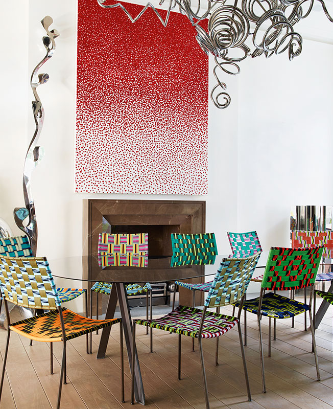 Над камином разместили абстракцию П. Уклански; этот художник родился в Варшаве, живет в Нью-Йорке. Разноцветные стулья — также произведения искусства под названием Uncle, их создал представитель австрийского акционизма Ф. Вест (1947–2012).