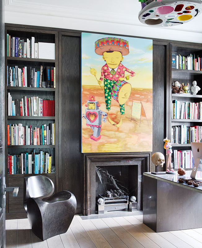 Кабинет хозяина дома. «Серьезное» помещение он украсил работой Electronic Eyes (2011), созданной Os Gemeos. Под этим псевдонимом работают бразильцы Г. и О. Пандолфо, известные также своими произведениями стрит-арта.