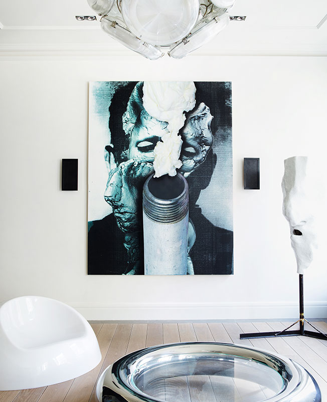 Отец четырех взрослых сыновей 66-летний Симон де Пюри, по уверениям друзей, значительно помолодел после свадьбы с Микаэлой, которая младше мужа на 19 лет. Одна из самых ярких фигур современного искусства, аукционист и диджей-любитель, арт-дилер и коллекционер, Симон де Пюри входит в сотню самых влиятельных людей современного арт-рынка. «Я вырос в Базеле, что безусловно сказалось на моих вкусах, — признается он. — В Швейцарии мощные традиции устройства эпохальных арт-выставок. Так что с ранних лет я видел лучшее искусство, какое только может быть. Я хотел стать художником. Мечтал о выразительных абстракциях, но рисовал всего лишь карикатуры. Позже оказался в Sotheby’s, где проработал 16 лет, семь лет курировал коллекцию барона Тиссен-Борнемисы — самое крупное частное собрание в 1970–80-х. Дня не проходило, чтобы он что-нибудь не прикупил». Над камином разместили абстракцию П. Уклански; этот художник родился в Варшаве, живет в Нью-Йорке. Разноцветные стулья — также произведения искусства под названием Uncle, их создал представитель австрийского акционизма Ф. Вест (1947–2012). Симон дослужился до главы европейского направления Sotheby’s, однако поворотным пунктом в его карьере явилось основание в 1997 году собственного аукционного дома. Четыре года спустя де Пюри стал одним из совладельцев Phillips de Pury — этот аукционный дом взял курс на суперсовременное искусство, так называемые «непросохшие», то есть совсем свежие картины, а также на ювелирные украшения и коллекционный дизайн. Здесь начался служебный роман Симона с будущей женой Микаэлой, с которой они проработали бок о бок 11 лет. Надо сказать, что их лавстори оказалась для всех сюрпризом — они вели себя так тихо, что даже близкие друзья узнали об их тайной свадьбе из сообщений, присланных по электронной почте. А в январе 2013 года еще одна новость ошарашила арт-мир: Симон и Микаэла покидают Philipps de Pury. У Симона де Пюри репутация самого известного и харизматичного аукциониста на арт-рынке. «Он обладает мощью Ferrari, элегантностью Maserati и шармом, как у Мисс Мира», — так отозвался о нем один из коллекционеров. Микаэла де Пюри (девичья фамилия Ноймайстер) родилась в Мюнхене. Как и муж, она с детства была погружена в искусство. Ее сестра Катрин сегодня управляет отцовским аукционным домом Neumeister. Сестра Мартина — совладелица другого аукционного дома. У пары долго не было собственного жилья: они путешествовали нон-стоп, останавливаясь в гостиницах. «В душе мы цыгане: нас увлекал кочевой образ жизни». Лишь недавно Симон и Микаэла наконец осели, обзавелись собственным «углом» в лондонском районе Мейфэр. Кабинет хозяина дома. «Серьезное» помещение он украсил работой Electronic Eyes (2011), созданной Os Gemeos. Под этим псевдонимом работают бразильцы Г. и О. Пандолфо, известные также своими произведениями стрит-арта. «Симон едва взглянул на этот дом и сказал: отлично, вот то, что надо, — вспоминает супруга. — И мы въехали сюда с коллекцией, которая все это время ждала своего часа в хранилищах». Семья создала новую компанию: de Pury de Pury — такая табличка висит рядом со звонком у двери. Экспертный опыт четы востребован и у коллекционеров, и у молодых художников. Chemical Wedding — произведение уроженца Цюриха У. Фишера (2009). На переднем плане столик из металла Ring, диз. Garouste