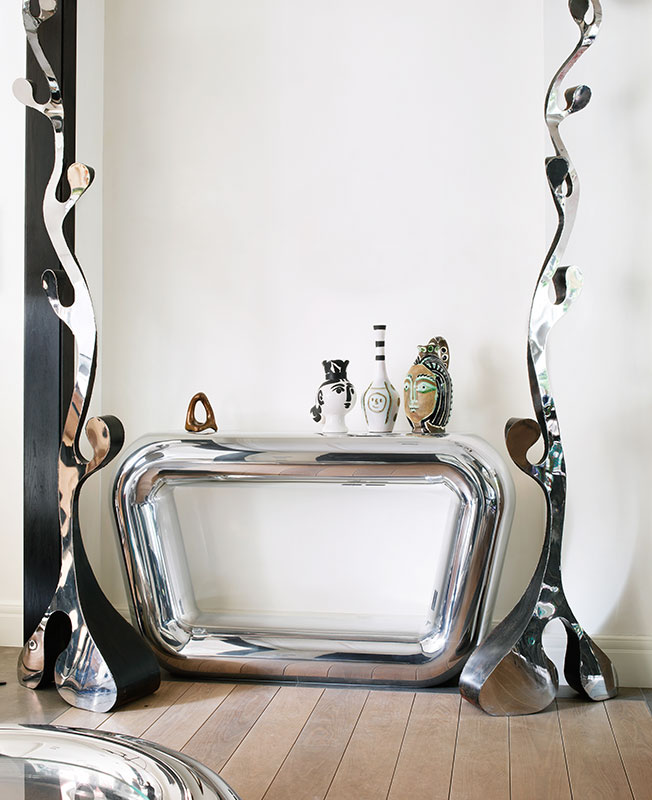 На консоли из металла, диз. М. Бонетти, керамика П. Пикассо. «Я люблю эти вещи за вложенный в них юмор», — говорит хозяин дома.