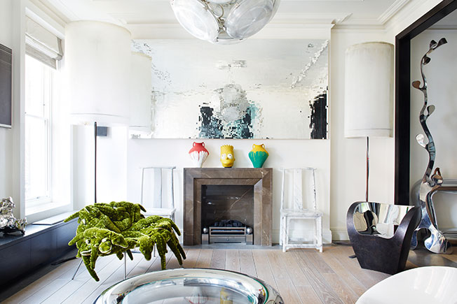 На камине две вазы китайского художника А. Вейвея. Арт-критики окрестили их «вандальными»: подлинники эпохи неолита автор замазал красками дешевых кричащих цветов. Кресло из плюшевых крокодилов, диз. Ф. и У. Кампана, кресло, диз. Р. Арад.