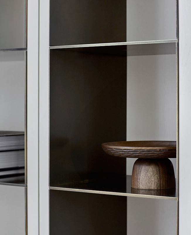 Гостиную и столовую украшают камины, по обеим сторонам которых разместили шкафы и стеллажи, выполненные на заказ. Открытые полки из окрашенного дуба облицованы бронзовыми листами. Опорами для мебели служат мраморные блоки, расцветка которых соответствует отделке каминных порталов.
