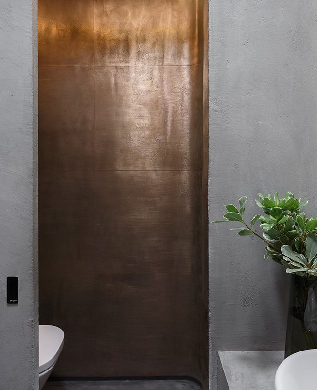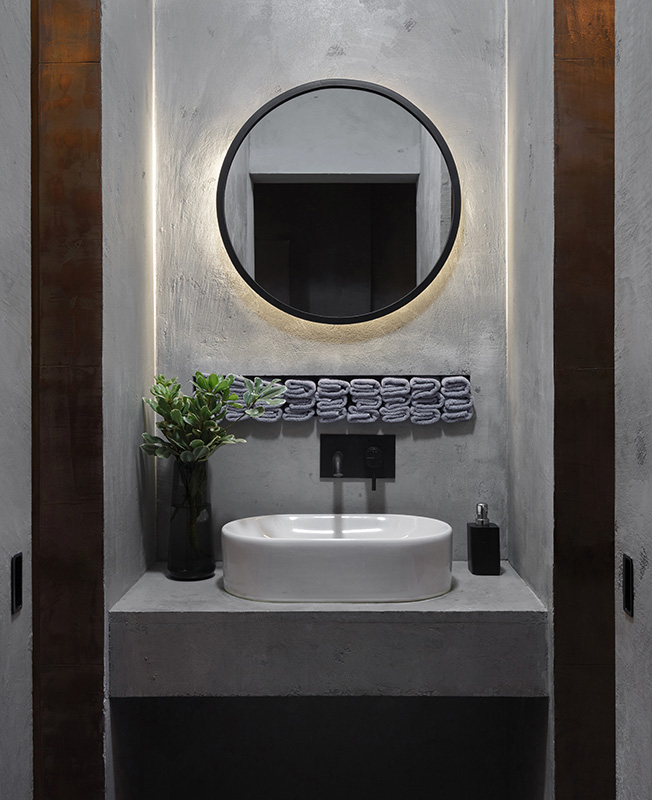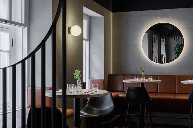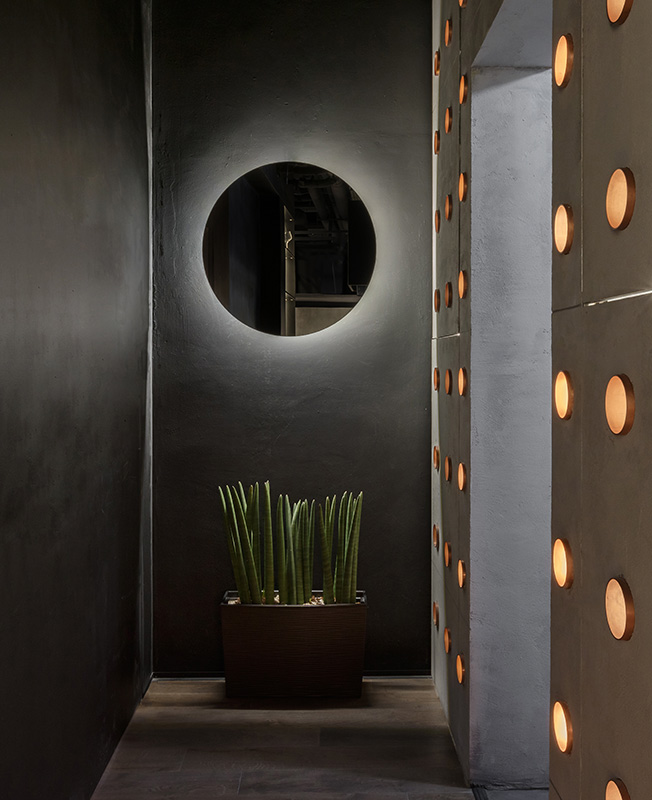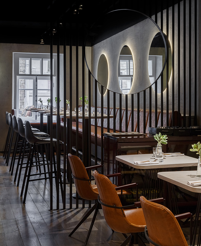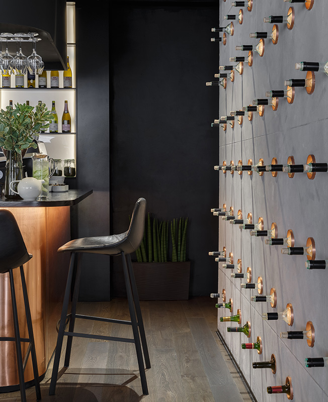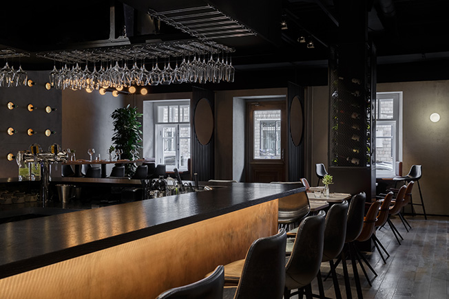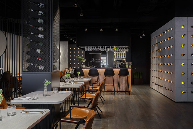 Плавные линии и природные оттенки мебели — черная и рыжая кожа обивок, столешницы из древесины — приглашают отдохнуть и расслабиться. Возле барной стойки — необычное решение для демонстрации бутылок. Дизайнер спроектировала бетонный куб с медными ячейками, подсвеченными изнутри: они и стали винными полками. За потайными створками — дополнительное пространство для хранения вина. С обратной стороны бетонной конструкции расположены санузлы.