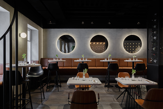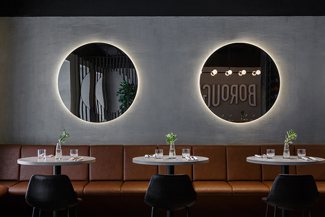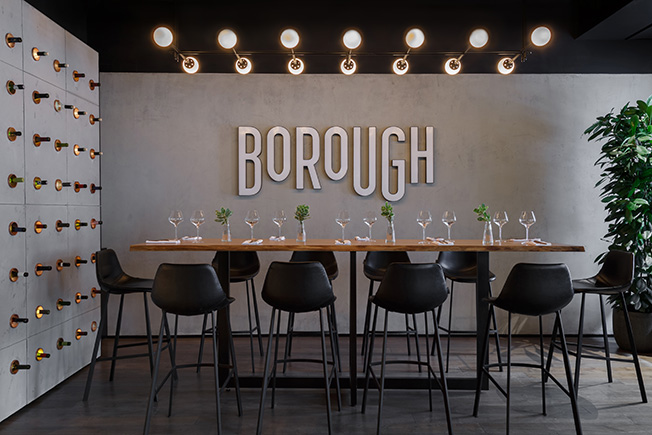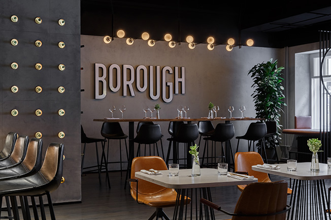 Концепция бара в Благовещенском переулке выстроена вокруг главного специалитета заведения — швейцарского блюда из сыра раклета. Название Borough отсылает к лондонскому рынку, где владельцы впервые попробовали это блюдо. Оформить интерьер пространства пригласили дизайнера Екатерину Федорову. Помещение площадью 200 кв. метров было мрачным, всего с тремя окнами. Вместо того, чтобы пытаться добавить света, темноту решили усугубить: черный цвет стен и потолка, с одной стороны, создает эффект уютной «шкатулки», с другой — скрадывает очертания и границы, делая помещение визуально больше. Островки света — подсветка барной стойки, круглых зеркал — притягивают взгляд. А также помогают зонировать пространство: придуманный Екатериной массивный светильник с четырнадцатью плафонами-шарами позволяет выделить стол для большой компании. Плавные линии и природные оттенки мебели — черная и рыжая кожа обивок, столешницы из древесины — приглашают отдохнуть и расслабиться. Возле барной стойки — необычное решение для демонстрации бутылок. Дизайнер спроектировала бетонный куб с медными ячейками, подсвеченными изнутри: они и стали винными полками. За потайными створками — дополнительное пространство для хранения вина. С обратной стороны бетонной конструкции расположены санузлы.
