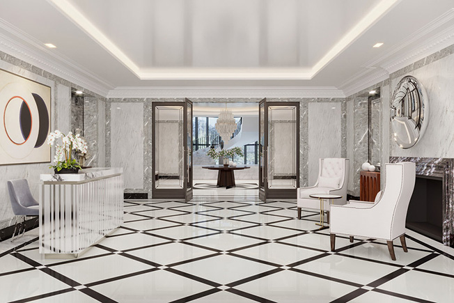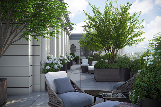 В большинстве квартир — две и более спален, при каждой гардеробная и ванная комната. На полу — мрамор и дубовый паркет. На кухнях — техника Gaggenau. На двух последних этажах — террасные сады с впечатляющим видом на город. Пентхаус площадью 700 кв. метров имеет свой сад на крыше, 100-метровый бальный зал и отдельный ресепшн.