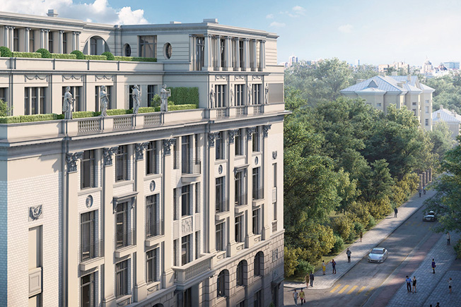 Дом расположен в паре минут ходьбы от Патриарших прудов, рядом театры, модные бутики, кафе и рестораны. Стилистика фасада — предреволюционная неоклассика: с рустом, колоннами, пилястрами, скульптурой и барельефами. Источником вдохновения для Дмитрия Великовского стали постройки его деда — архитектора Бориса Михайловича Великовского (1878-1937).