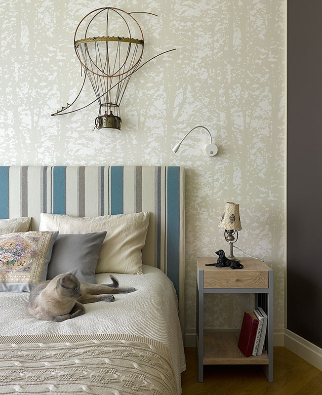 Спальня. Кровать изготовлена на заказ компанией «Артконцепт», прикроватные тумбы — Vysotka Home. Изголовье отделано шерстяной тканью Casamance. Обои Schumacher. Объект на стене: 20 Сentury Lamps.